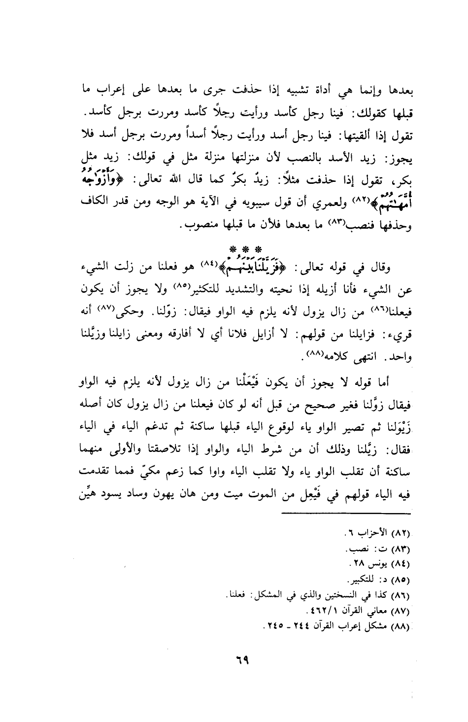 وقال في قوله تعالى: (فزيَّلنا بينهمْ) هو فعلنا من زلت الشيء عن الشيء فأنا أزيله إذا نحيته والتشديد للتكثير ولا يجوز أن يكون فيعلنا من زوال يزول لأنه يلزم فيه الواو فيقال: زولنا. وحكى أنه فريء: فزايلنا من قولهم: لا أزايل فلاناً أي لا أفارقه ومعنى زايلنا وزيلنا واحد. انتهى كلامه.