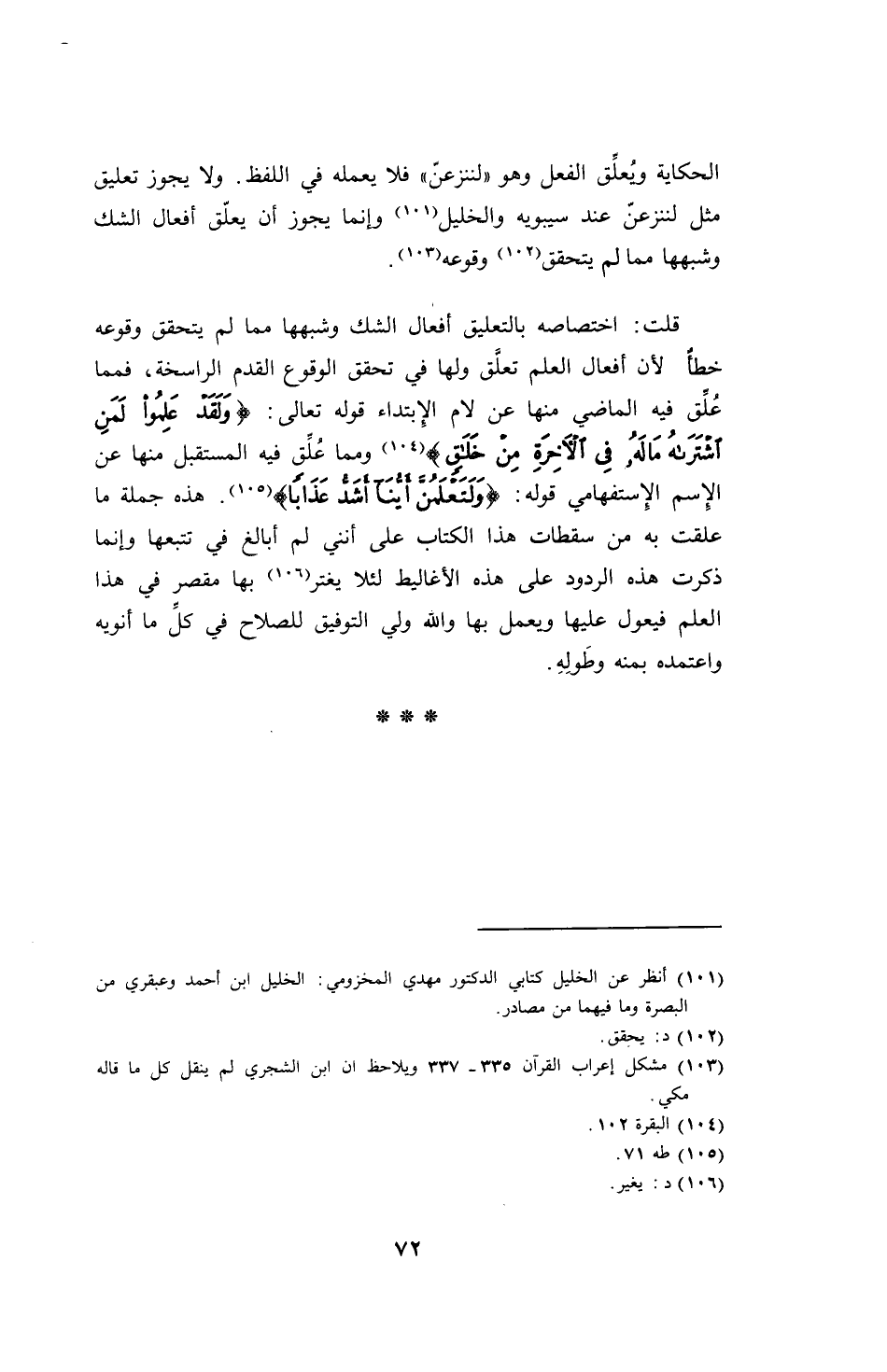 قلت: اختصاصه بالتعليق أفعال الشك وشبهها مما لم يتحقق وقوعه خطأ لأن أفعال العلم ولها في تحقق الوقوع القدم الراسخة، فمما علق فيه الماضي منها عن لام الابتداء قوله تعالى: (ولقدْ علمواْ لمنِ اشتراهُ مالهُ في الآخرةِ منْ خلاقٍ) ومما علق فيه المستقبل منها عن الاسم الاستفهامي قوله: (ولتعلمنَّ أيُّنا أشدُّ عذاباً). هذه جملة ما علقت به من سقطات هذا الكتاب على أنني لم أبالغ في تتبعها وإنما ذكرت هذه الردود على هذه الأغاليط لئلا يغتر بها مقصر في هذا العلم فيعول عليها ويعمل بها والله ولي التوفيق للصلاح في كل ما أنويه واعتمده بمنه وطوله.