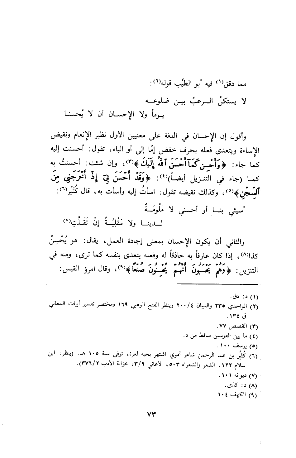 وأقول إن الإحسان في اللغة على معنيين الأول نظير الإنعام ونقيض الإساءة ويتعدى فعله بحرف خفض إما إلى أو الباء، تقول: أحسنت إليه كما جاء: (وأحسن كما أحسنَ اللهُ إليكَ)، وإن شئت: أحسنت به كما (جاء في التنزيل أيضاً): (وقدْ أحسنَ بي إذْ أخرجني منَ السِّجنِ)، وكذلك نقيضه تقول: أسأت إليه وأسأت به، قال كثير: