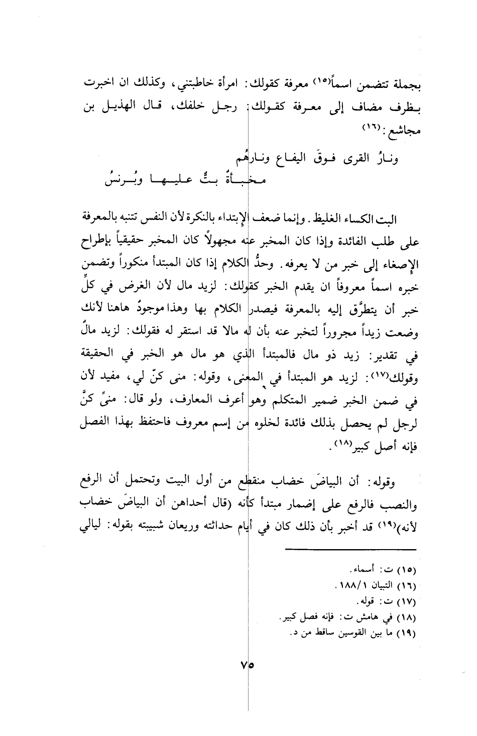 البت الكساء الغليظ. وإنما ضعف الابتداء بالنكرة لأن النفس تتنبه بالمعرفة على طلب الفائدة وإذا كان المخبر عنه مجهولاً كان المخبر حقيقياً بإطراح الإصغاء إلى خبر من لا يعرفه. وحدُّ الكلام إذا كان المبتدأ منكوراً وتضمن خبره اسماً معروفاً أن يقدم الخبر كقولك: لزيد مال لأن الغرض في كل خبر أن يتطرق إليه بالمعرفة فيصدر الكلام بها وهذا موجود هاهنا لأنك وضعت زيداً ومجروراً لتخبر عنه بأن له مالا قد استقر له فقولك: لزيد مال في تقدير: زيد ذو مال فالمبتدأ الذي هو مال هو الخبر في الحقيقة وقولك: لزيد هو المبتدأ في المعنى، وقوله: متى كن لي، مفيد لأن في ضمن الخبر ضمير المتكلم وهو أعرف المعارف، ولو قال: منًى كنَّ لرجل لم يحصل بذلك فائدة لخلوه من اسم معروف فاحتفظ بهذا الفصل فإنه أصل كبير.