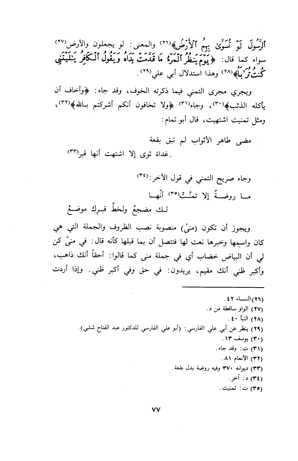الرَّسولَ لوْ تسوَّى بهم الأرضُ) والمعنى: لو يجعلون والأرض سواء كما قال: (يومَ ينظرُ المرءُ ما قدَّمتْ يداهُ ويقولُ الكافرُ يا ليتني كنتُ تراباً) وهذا استدلال أبي علي.