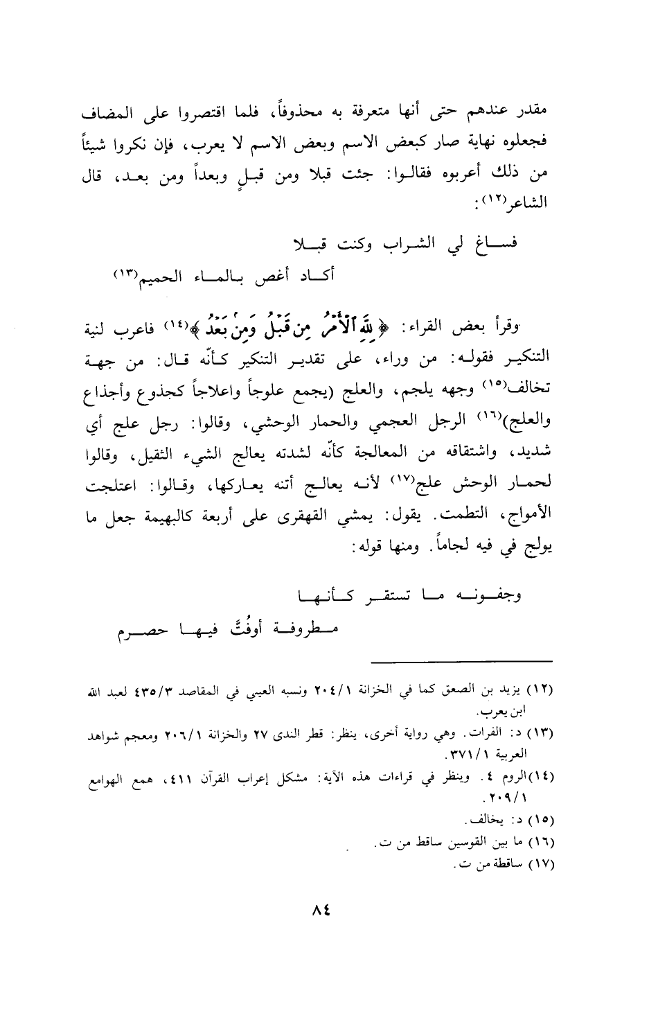 وقرأ لبعض القراء: (للهِ الأمرُ من قبلُ ومنْ بعدُ) فأعرب لنية التنكير فقوله: ن وراء، على تقدير التنكير كأنه قال: من جهة تخالف وجهه يلجم، والعلج (يجمع علوجاً وإعلاجاً كجذوع وأجذاع والعلج) الرجل العجمي والحمار الوحشي، وقالوا: رجل علج أي شديد، واشتقاقه من المعالجة كأنه لشدته يعالج الشيء الثقيل، وقالوا لحمار الوحش علج لأنه يعالج أتنه يعاركها، وقالوا: اعتلجت الأمواج، التطمت. يقول: يمشي القهقرى على أربعة كالبهيمة جعل ما يوج في قيه لجاماً. ومنها قوله: