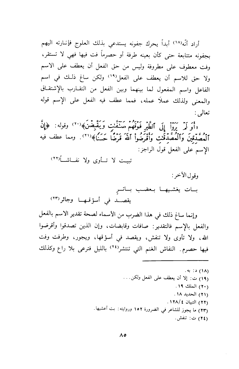 وإنما ساغ ذلك في هذا الضرب من الأسماء لصحة تقدير الاسم بالفعل والفعل بالاسم فالتقدير: صافات وقابضات، وإن الذين تصدقوا وأقرضوا الله، ولا تأوى ولا تنفش، ويقصد في أسؤقها، ويجور، وطرفت وفت فيها حصرم. النفاش الغنم التي تنتشر بالليل فترعى بلا راع وكذلك