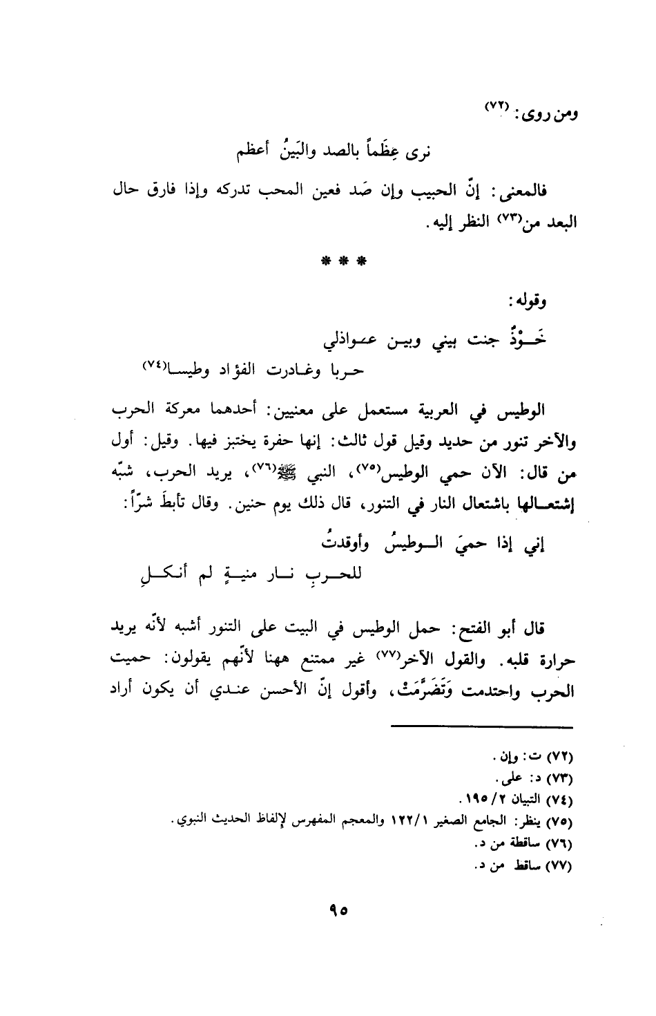 قال أبو الفتح: حمل الوطيس في البيت على التنور أشبه لأنه يريد حرارة قلبه. والقول الآخر غير ممتنع ههنا لأنهم يقولون: حميت الحرب واحتدمت وتضرمت، وأقول إن الأحسن عندي أن يكون أراد