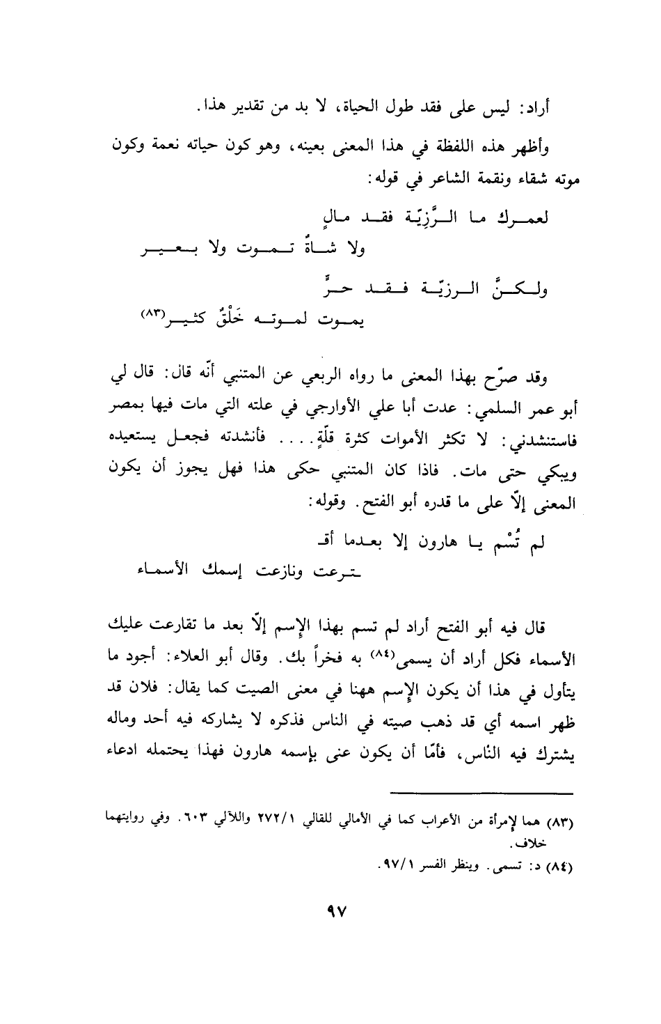 وقد صرح بهذا المعنى ما رواه الربعي عن المتنبي أنه قال: قال لي أبو عمر السلمي: عدت أبا علي الأوارجي في علته التي مات فيها بمصر فاستنشدني: لا تكثر الأموات كثرة قلةٍ .... فأنشدته فجعل يستعيده ويبكي حتى مات. فإذا كان المتنبي حكى هذا فهل يجوز أن يكون المعنى إلا على ما قدره أبو الفتح. وقوله: