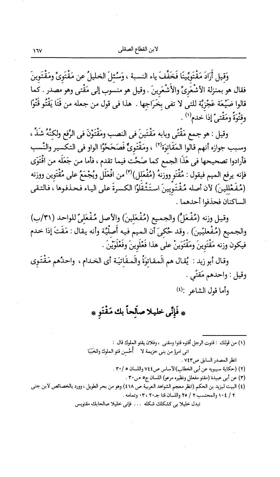 وقيل: هو جمع مقتى وبابه مقتين فى النصب ومقتون فى الرفع ولكنه شذ، وسبب جوازه أنهم قالوا المقاتوة، ومقتوى فصححوا الواو فى التكسير والنسب فأرادوا تصحيحها فى هذا الجمع كما صحت فيما تقدم، فأما من جعله من اقتوى فإنه يرفع الميم فيقول: مقتو ووزنه (مفعلل) من افعلل ويجمع على مقتوين ووزنه (مفعللين) لأن أصله مقتويينن استثقلوا الكسرة على الياء فحذفوها، فالتقى الساكنان فحذفوا أحدهما.