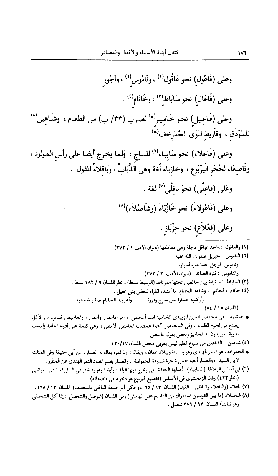وعلى (فاعيل) نحو خاميز لضرب (33/ب) من الطعام، وشاهين للوذق، وقاريط لنوى الحمرخف.