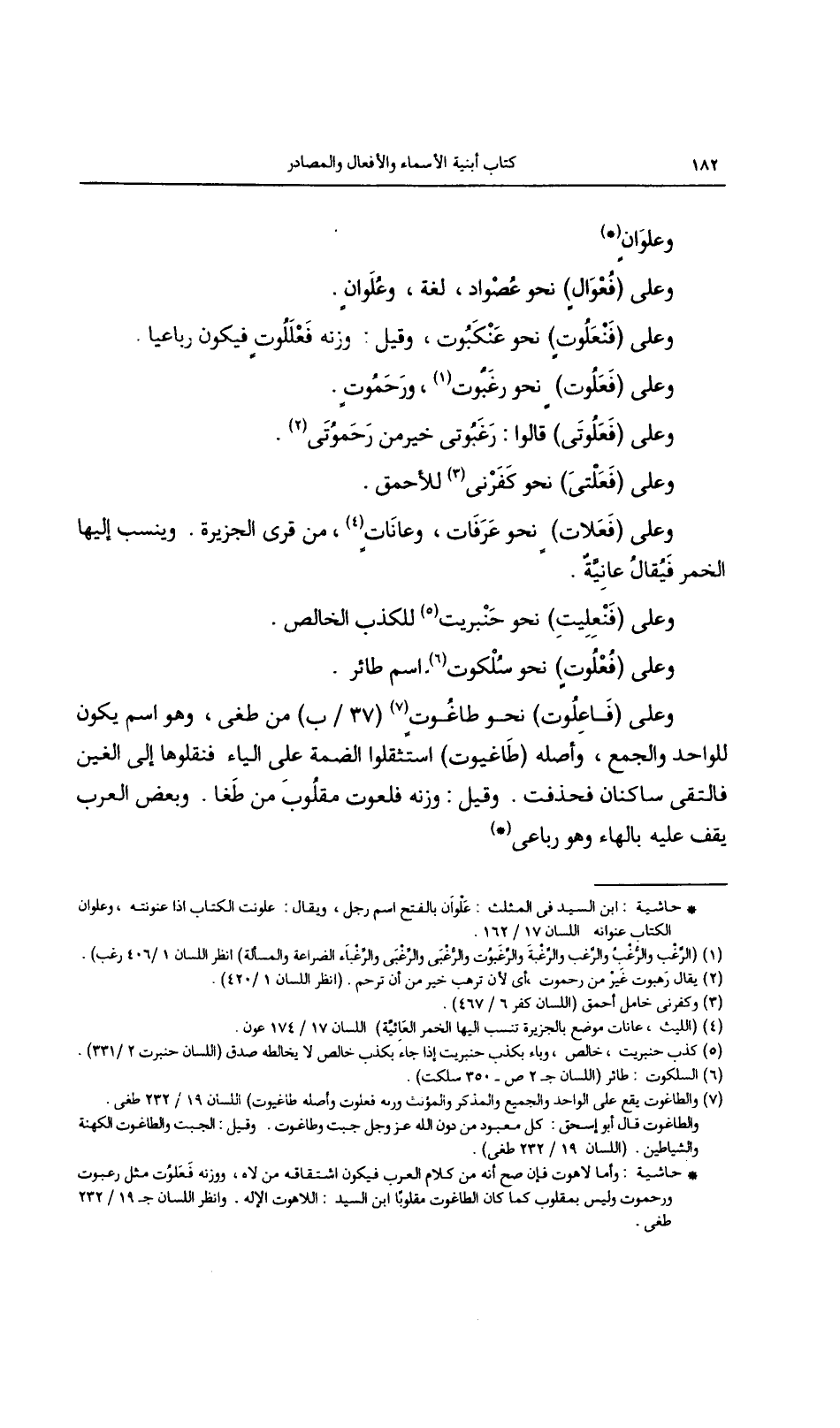 وعلى (فاعلوت) نحو طاغوت (37/ب) من طغى، وهو اسم يكون للواحد والجمع، وأصله (طاغيوت) استثقلوا الضمة على الياء فنقلوها إلى الغين فالتقى ساكنان فحذفت. وقيل: وزنه فلعوت مقلوب من طغا. وبعض العرب يقف عليه بالهاء وهو رباعي