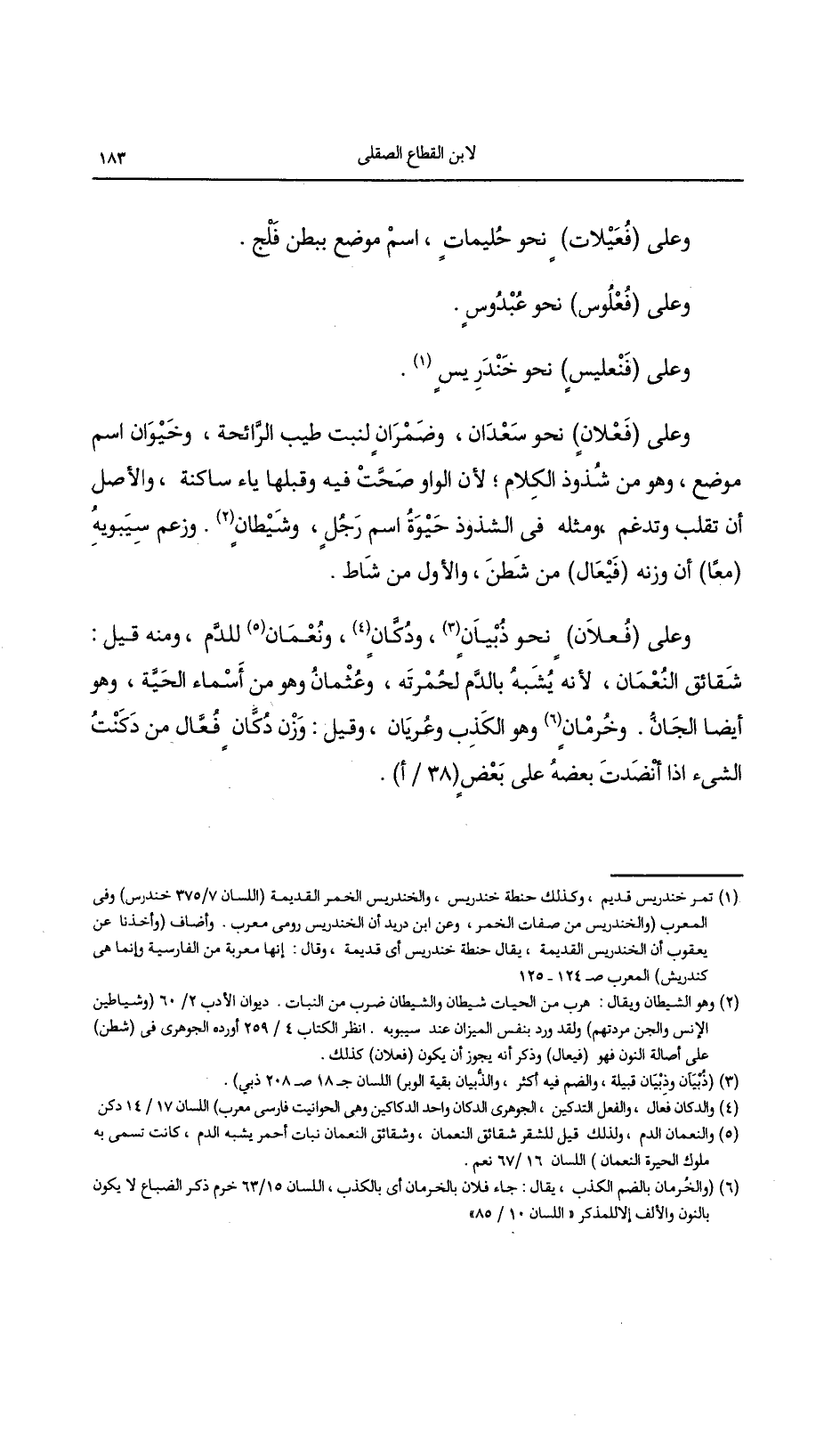 وعلى (فعلان) نحو ذبيان، ودكان، ونعمان للدم، ومنه قيل: شقائق النعمان، لأنه يشبه بالدم حمرته، وعثمان وهو من أسماء الحية، وهو أيضا الجان. وخرمان وهو الكذب وعريان، وقيل: وزن دكان فعال من دكنت الشئ إذا أنضدت بعضه على بعض (38/أ).