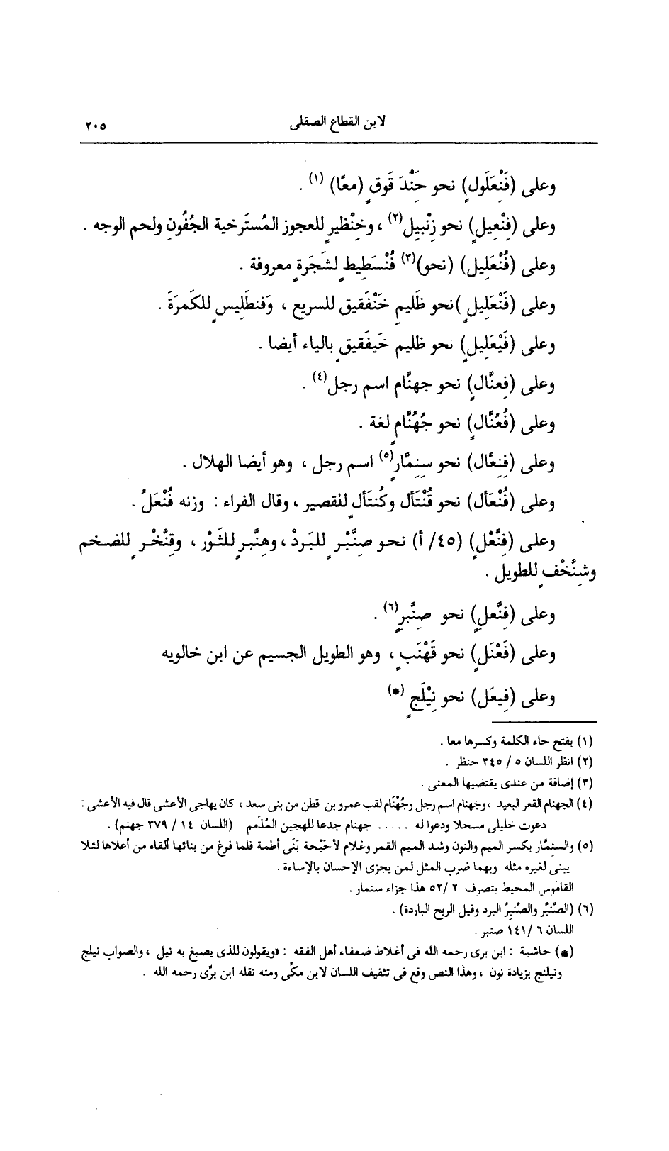 وعلى (فنعل) (45/أ) نحو صنبر للبرد, وهنبر للثور, وقنخر للضخم وشنخف للطويل.