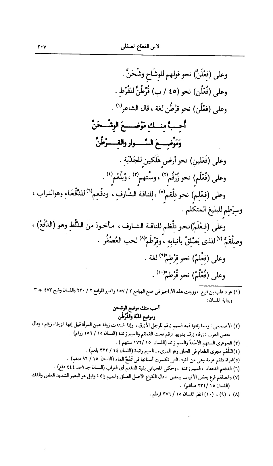 وعلى (فعلم) نحو دلظم للناقة الشارف, مأخوذ من الدلظ وهو (الدفع) , وصلقم للذي يصلق بأنيابه, وقرطم لحب العصفر.