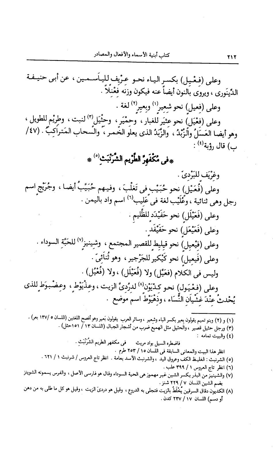 وعلى (فعيل) نحو عثير للغبار, وحمير, وحثيل لنبت, وطريم للطويل, وهو أيضا العسل والزبد, والزبد الذي يعلو الخمر, والسحاب المتراكب. (47/ب) قال رؤبة: