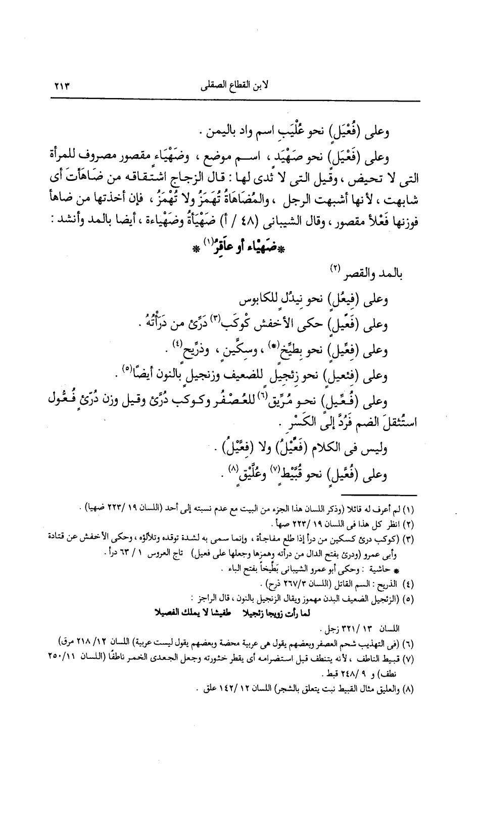 على (فعيل) نحو صهيد, اسم موضع, وضهياء مقصور مصروف للمرأة التي لا تحيض, وقيل التي لا ثدي لها: قال الزجاج اشتقاقه من ضاهأت أي شابهت, لأنها أشبهت الرجل, والمضاهأة تهمز ولا تهمز, فإن أخذتها من ضاهأ فوزنها فعلا مقصور, وقال الشيباني (48/أ) ضهيأة وضهياءة, أيضا بالمد وأنشد: