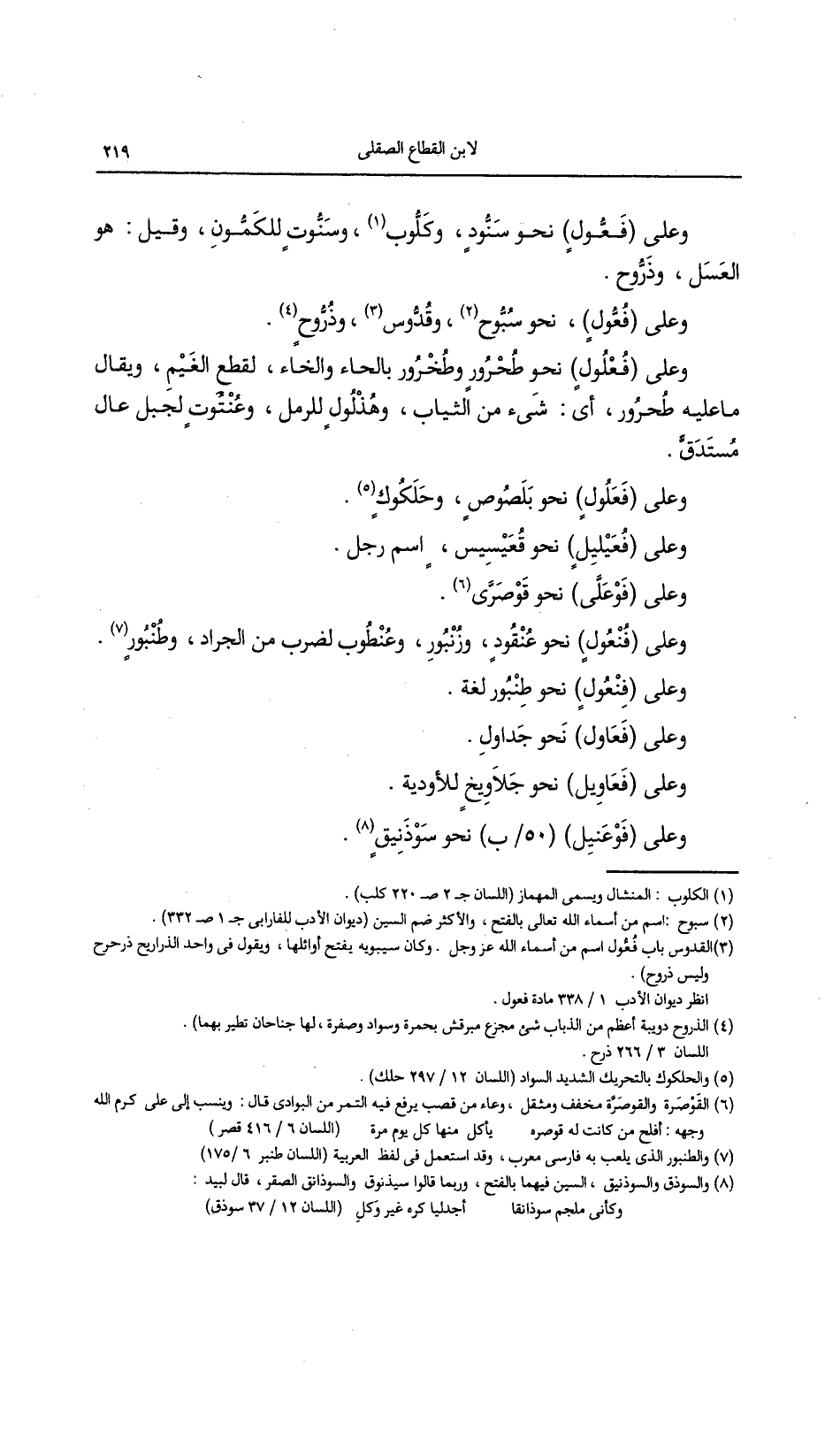 وعلى (فعلول) نحو طحرور وطخرور بالحاء والخاء, لقطع الغيم, ويقال ما عليه طحرور, أي: شيء من الثياب, وهذلول للرمل, وعنتوت لجبل عال مستدق.
