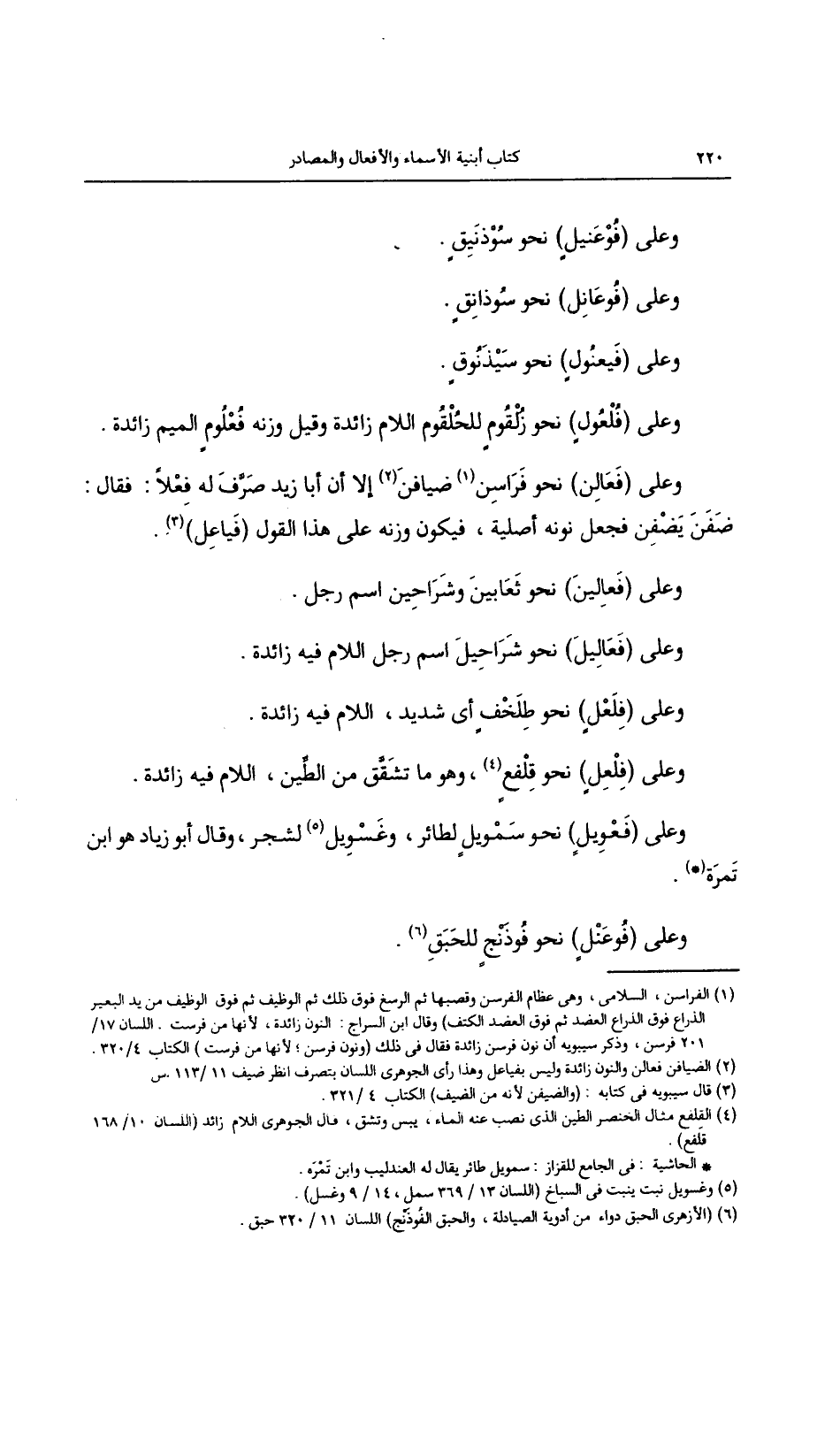 وعلى (فعالن) نحو فراسن ضيافن إلا أن أبا زيد صرف له فعلا: فقال: ضفن يضفن فجعل نونه أصلية, فيكون وزنه على هذا القول (فياعل).