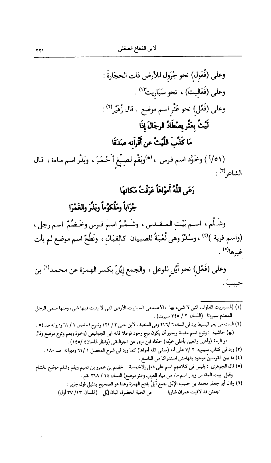 وشلم, اسم بيت المقدس, وشمر اسم فرس وخضم اسم رجل, (واسم قرية) , وسدر وهي لعبة للصبيان كالفيال, ونطح اسم موضع لم يأت غيرها.