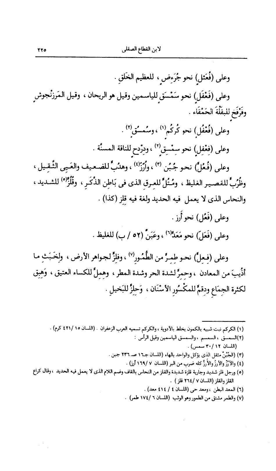 وعلى (فعل) نحو طمر من الطمور, وفلز لجواهر الأرض , ولخبث ما أذيب من المعادن, وحمر لشدة الحر وشدة المطر وهمل للكساء العتيق, وهبق لكثرة الجماع ودقم للمكسور الأسنان, وحلز للبخيل.