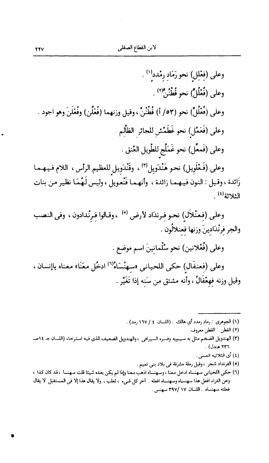 وعلى (فعنلال) نحو فرنداد لأرض, وقالوا فرندادون, وفي النصب والجر فرندادين وزنها فعنلالون.