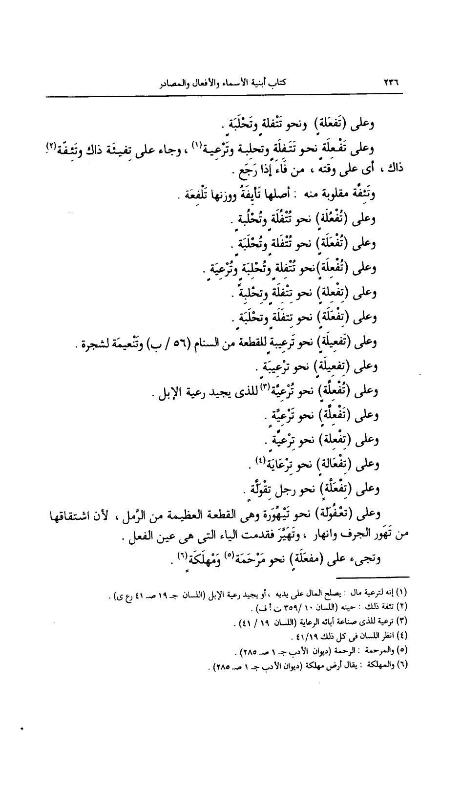 وعلى (تفعلة) نحو ترعيبة للقطعة من السنام (56/ب) وتنعيمة لشجرة.