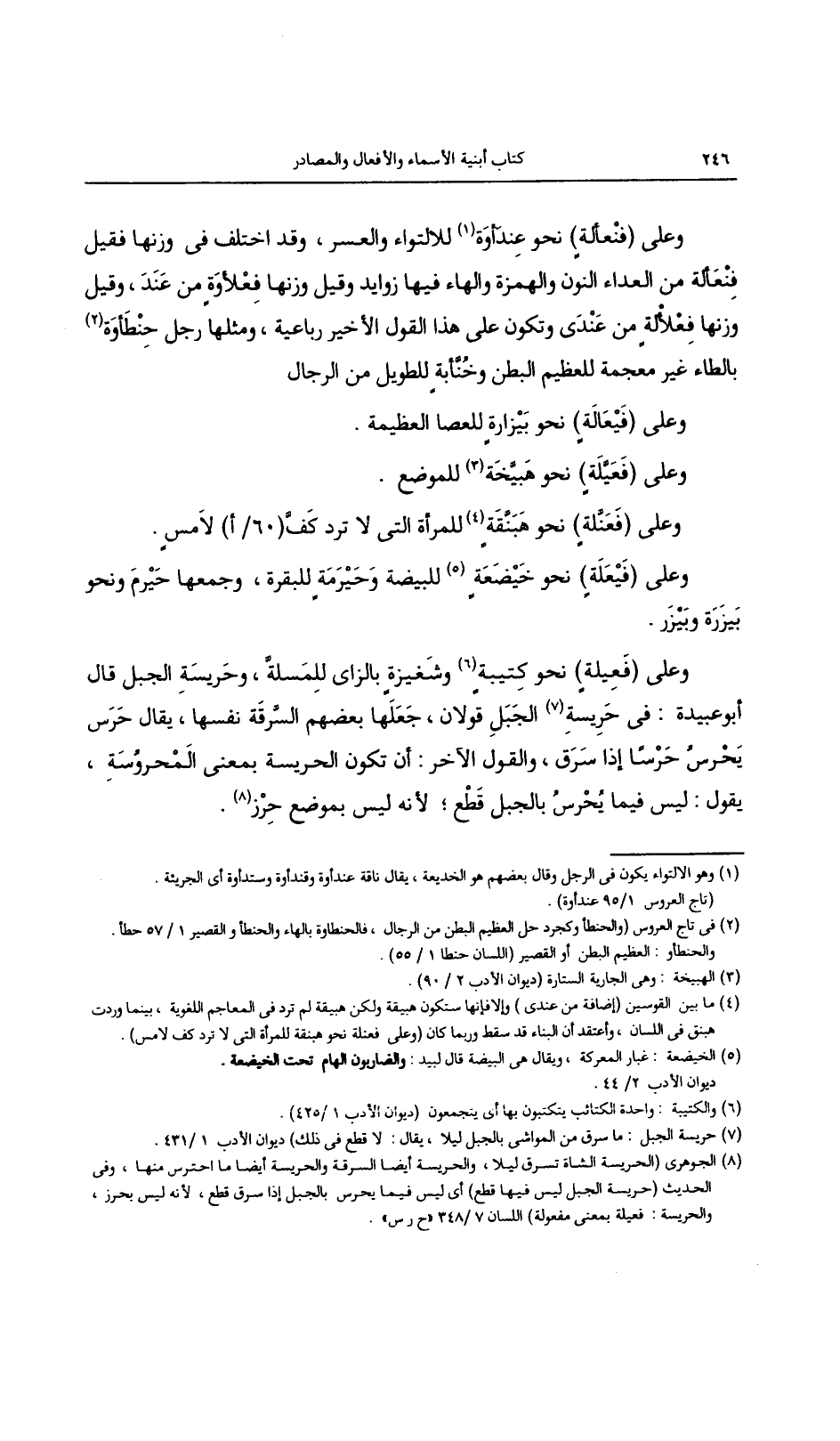 وعلى (فنعألة) نحو عندأوة للالتواء والعسر، وقد اختلف فى وزنها فقيل فنعألة من العداء النون والهمزة والهاء فيها زوايد وقيل وزنها فعلأوة من عند، وقيل وزنها فعلألة من عندى وتكون على هذا القول الأخير رباعية، ومثلها رجل حنطأوة بالطاء غير معجمة للعظيم البطن وخنأبة للطويل من الرجال.