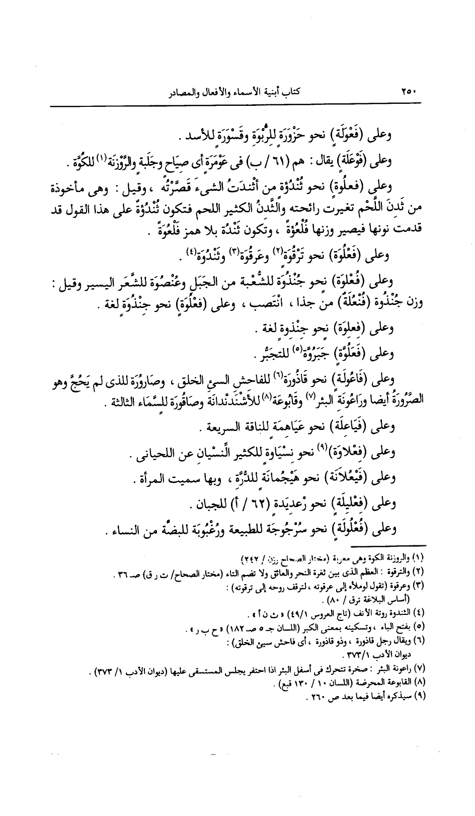وعلى (فاعولة) نحو قاذورة للفاحش السيء الخلق، وصارورة للذي لم يحج وهو الصرورة أيضاً وراعونة البئر وقابوعة للأشندندانة وصاقورة للسماء الثالثة.