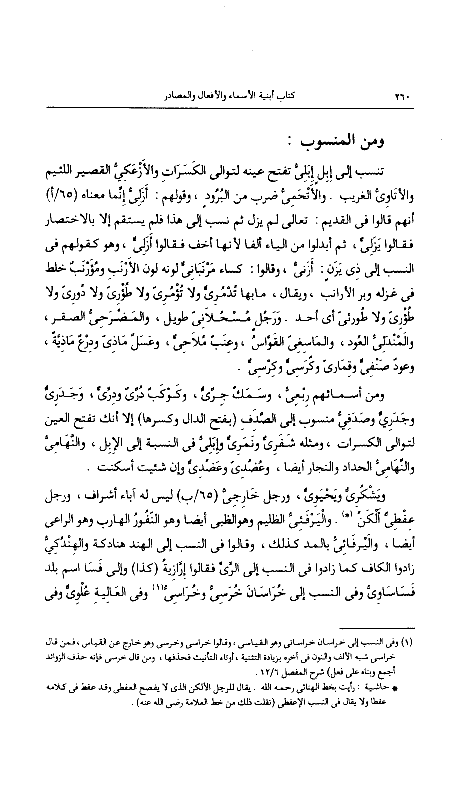 ويشكرى ويحيوى، ورجل خارجى (65/ب) ليس له آباء أشراف، ورجل عفطى ألكن. واليرفئى الظليم وهو الظبى أيضاً وهو النفور الهارب وهو الراعى أيضا، واليرفائى بالمد كذلك، وقالوا فى النسب إلى الهند هنادكة والهندكى زادوا الكاف كما زادوا فى النسب إلى الى فقالوا إرازية (كذا) وإلى فسا اسم بلد فساساوى وفى النسب إلى خراسان خرسى وخراسى وفى العالية علوي وفي