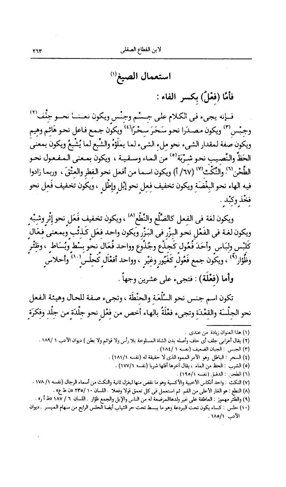 فإنه يجئ فى الكلام على جسم وجنس ويكون نعتا نحو جلف وجبس ويكون مصدرا نحو سحر سحراً ويكون جمع فاعل نحو هائم وهيم ويكون صفة لمقدار الشيء نحو ملء الشئ لما يملؤه والشبع لما يشبع ويكون بمعنى الحظ والنصيب نحو شربة من الماء وسقية، ويكون بمعنى المفعول نحو الطحن والنكث (67/أ) ويكون اسما من أفعل نحو الفطر والعتق، وربما زادوا فيه الهاء نحو البغضة ويكون تخفيف فعل نحو إبل وإطل، ويكون تخفيف فعل نحو فخذٍ وكبدٍ.