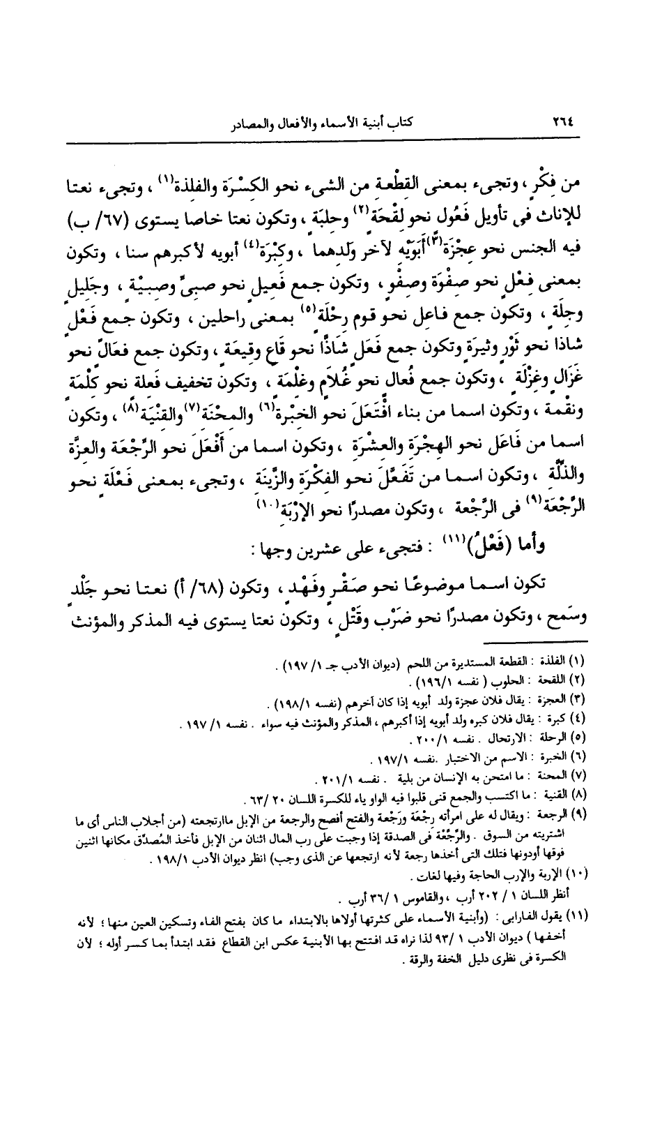 من فكرٍ، وتجئ بمعنى القطعة من الشئ نحو الكسرة والفلذة، وتجئ نعتا للإناث فى تأويل فعول نحو لقحة وحلبة، وتكون نعتا خاصا يستوى (67/ب) فيه الجنس نحو عجزة أبوية لآخر ولدهما، وكبرة أبويه لأكبرهم سنا، وتكون بمعنى فعل نحو صفوة وصفو، وتكون جمع فعيل نحو صبى وصبية، وجليل وجلة، وتكون جمع فاعل نحو قوم رحلة بمعنى راحلين، وتكون جمع فعل شاذا نحو ثور وثيرة وتكون جمع فعل شاذاً نحو قاع وقيعة، وتكون جمع فعال نحو غزال وغزلة، وتكون جمع فعال نحو غلام وغلمة، وتكون تخفيف فعلة نحو كلمة ونقمة، وتكون اسما من بناء افتعل نحو الخبرة والمحنة والقنية، وتكون اسما من فاعل نحو الهجرة والعشرة، وتكون اسما من أفعل نحو الرجعة والعزة والذلة، وتكون اسما من تفعل نحو الفكرة والزينة، وتجئ بمعنى فعلة نحو الرجعة فى الرجعة، وتكون مصدرًا نحو الإربة.