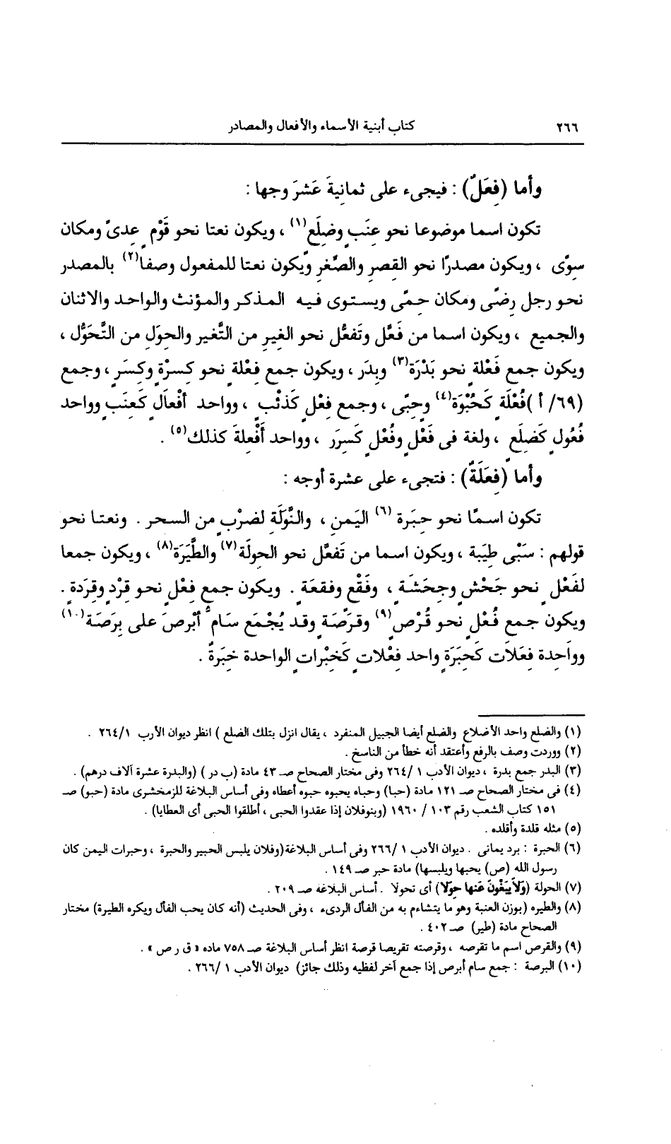 تكون اسما موضوعا نحو عنب وضلع، ويكون نعتا نحو قوم عدى ومكان سوى، ويكون مصدرا نحو القصر والصغر ويكون نعتا للمفعول وصفا بالمصدر نحو رجل رضى ومكان حمى ويستوى فيه المذكر والمؤنث والواحد والاثنان والجميع، ويكون اسما من فعل وتفعل نحو الغير من التغير والحول من التحول، ويكون جمع فعلة نحو بدرة وبدر، ويكون جمع فعلة نحو كسرة وكسر، وجمع (69/أ) فعلة كحبوة وحبى، وجمع فعل كذئب، وواحد أفعال كعنب وواحد فعول كضلع، ولغة فى فعل وفعل كسرر، وواحد أفعلة كذلك.