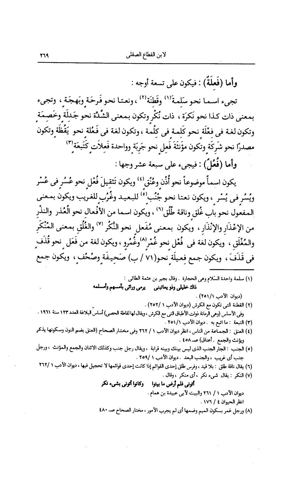 يكون اسما موضوعا نحو أذن وعنق ويكون تثقيل فعل نحو عسر فى عسر ويسير فى يسر، ويكون نعتا نحو جنب للبعيد وغرب للغريب ويكون بمعنى المفعول نحو باب غلق وناقة طلق، ويكون اسما من الأفعال نحو العذر والنذر من الإعذار والإنذار، ويكون بمعنى مفعل نحو النكر والغلق بمعنى المنكر والمغلق، ويكون لغة فى فعل نحو غمر وغمرو، ويكون لغة من فعل نحو قذف فى قذف، ويكون جمع فعيلة نحو (71/ب) صحيفة وصحف، ويكون جمع