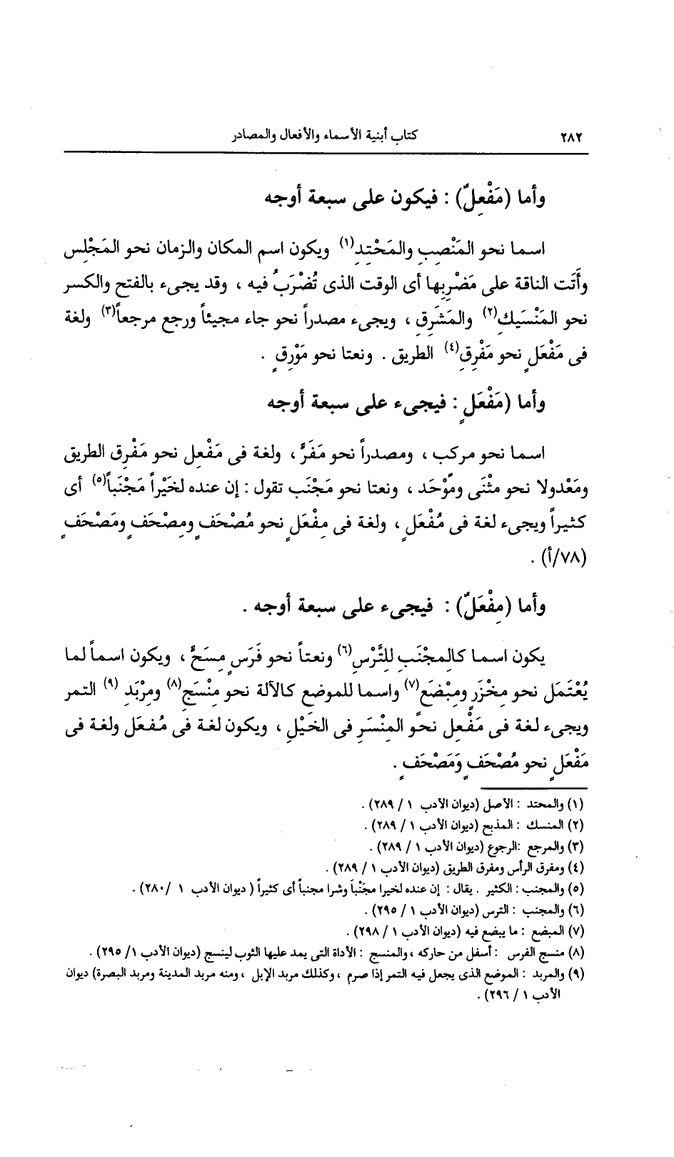 اسما نحو مركب، ومصدرا نحو مفر، ولغة فى مفعل نحو مفرق الطريق ومعدولا نحو مثنى وموحد، ونعتا نحو مجنب تقول: إن عنده لخيراً مجنباً أى كثيراً ويجئ لغة فى مفعل، ولغة فى مفعل نحو مصحف ومصحف ومصحف (78/أ).
