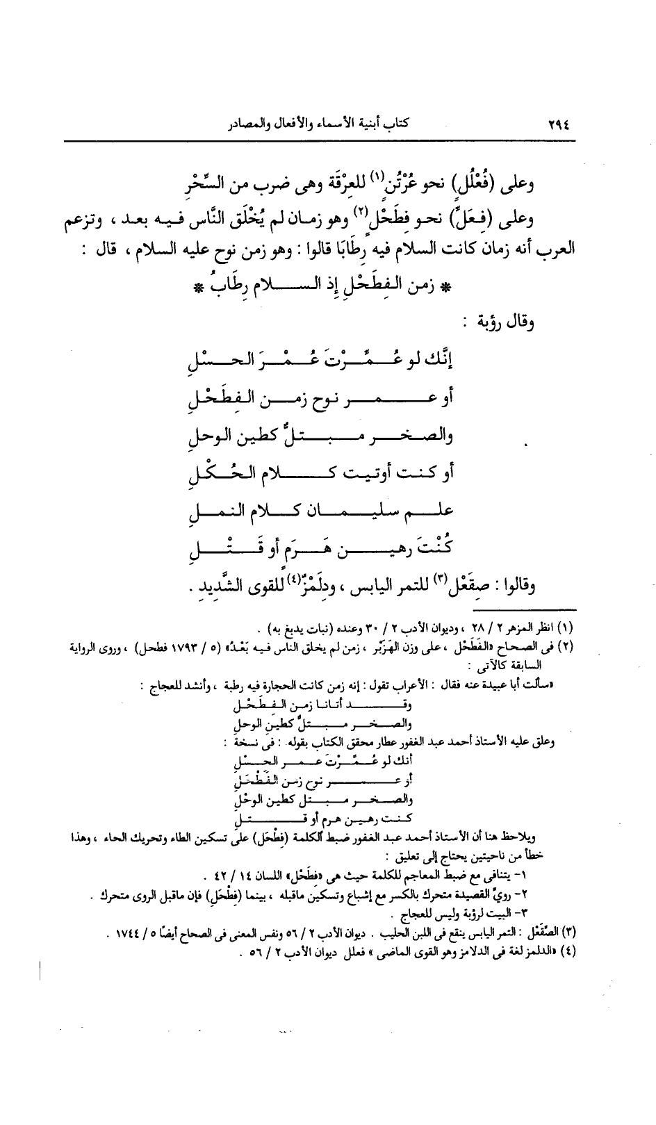 وعلى (ف\عَل) نحو فطحل وهو زمان لم يخلق الناس فيه بعد، وتزعم العرب أنه زمان كانت السلام فيه رطابا قالوا: وهو زمن نوح عليه السلام، قال: