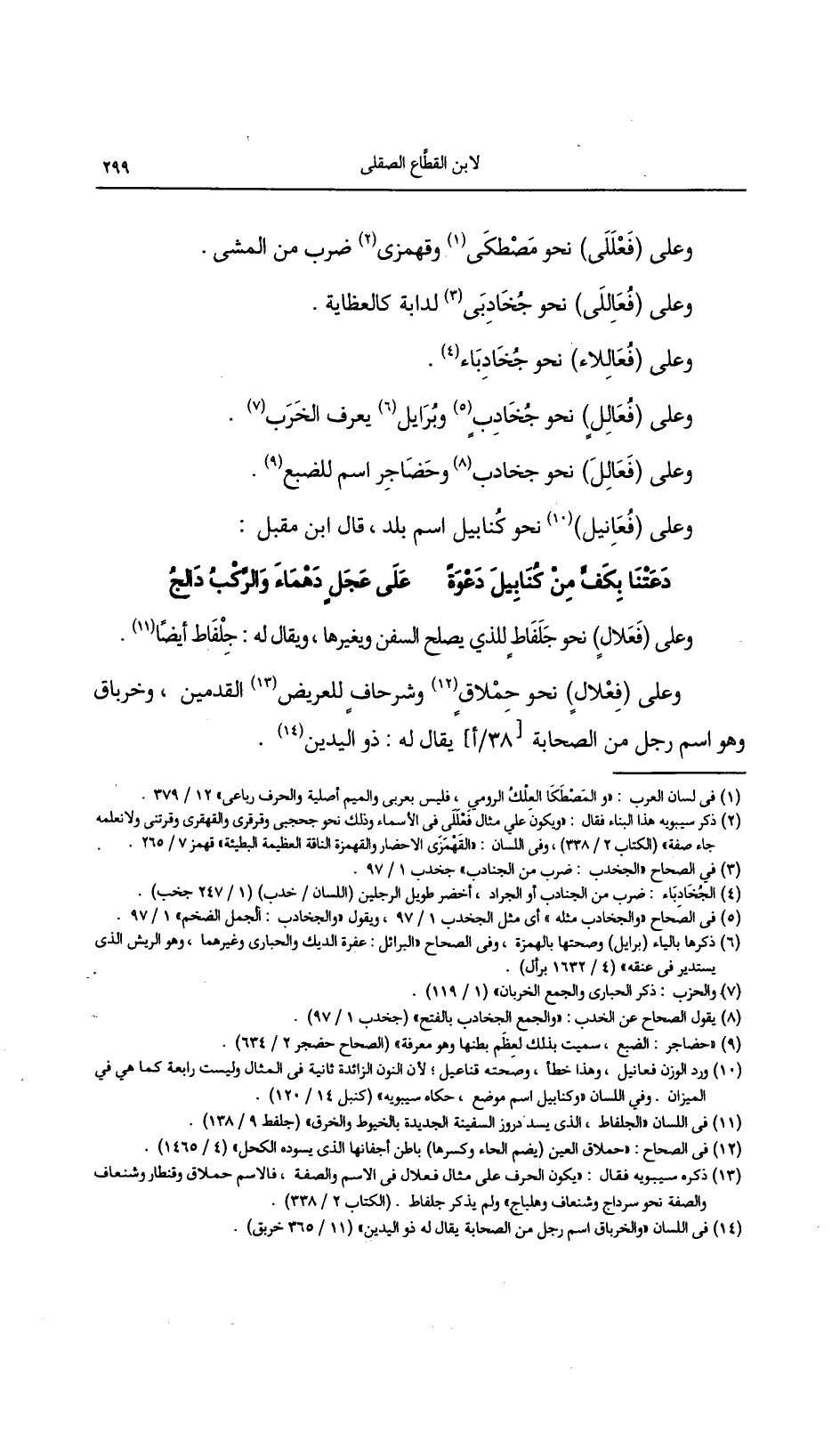 وعلى (فعلال) نحو حملاق وشرحاف للعريض القدمين، وخرباق وهو اسم رجل من الصحابة [38/أ] يقال له: ذو اليدين.