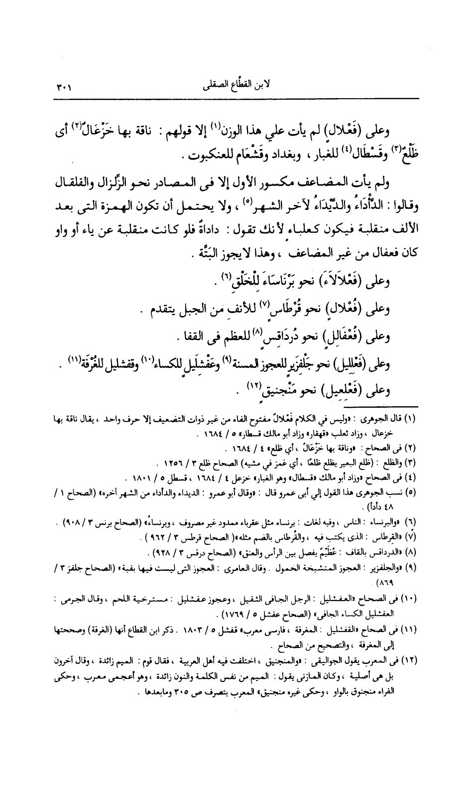 وعلى (فُعلالٍ) نحو قرطاسٍ للأنف من الجبل يتقدم.