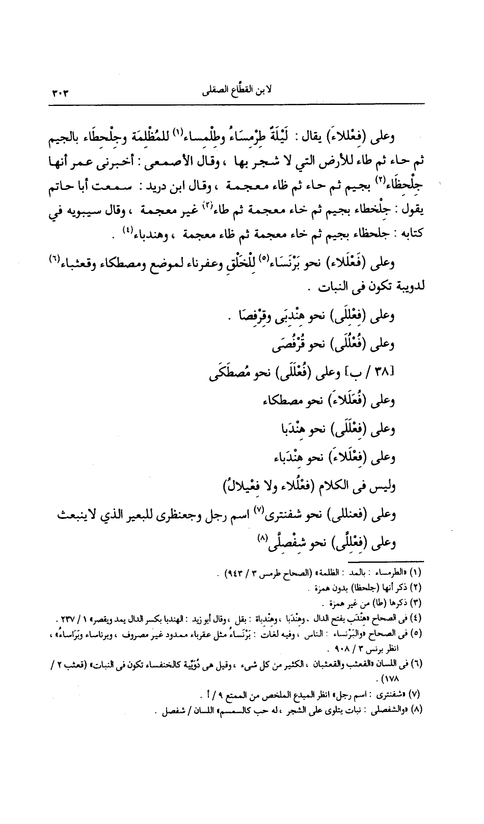 وعلى (فِعللاء) يقال: ليلة طرمساء وطلمساء للظلمة وجلحطاء بالجيم ثم حاء ثم طاء للأرقض التي لا شجر بها، وقال الأصمعي: أخبرني عمر أنها جلحظاء بجيم ثم حاء ثم ظاء معجمة، وقال ابن دريد: سمعت أبا حاتم يقول: جلحظاء بجيم ثم حاء ثم ظاء معجمة، وقال ابن دريرد: سمعت أبا حاتم يقول: جلخطاء بجيم ثم خاء معجمة ثم طاء غير معجمة، وقال سيبويه في كتابه: جلحظاء بجيم ثم خاء معجمة ثم ظاء معجمة، وهندباء.