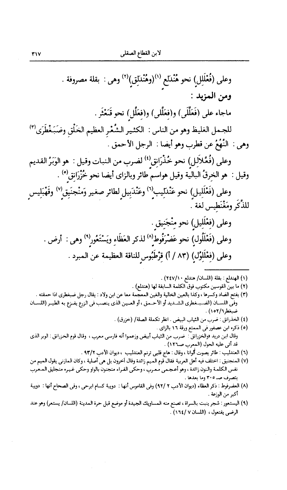 وعلى (فعلليلٍ) نحو عندليبٍ وعندبيلٍ لطائر صغير ومنجنيقٍ وقهبليسٍ للذكر ومغنطيس لغة.
