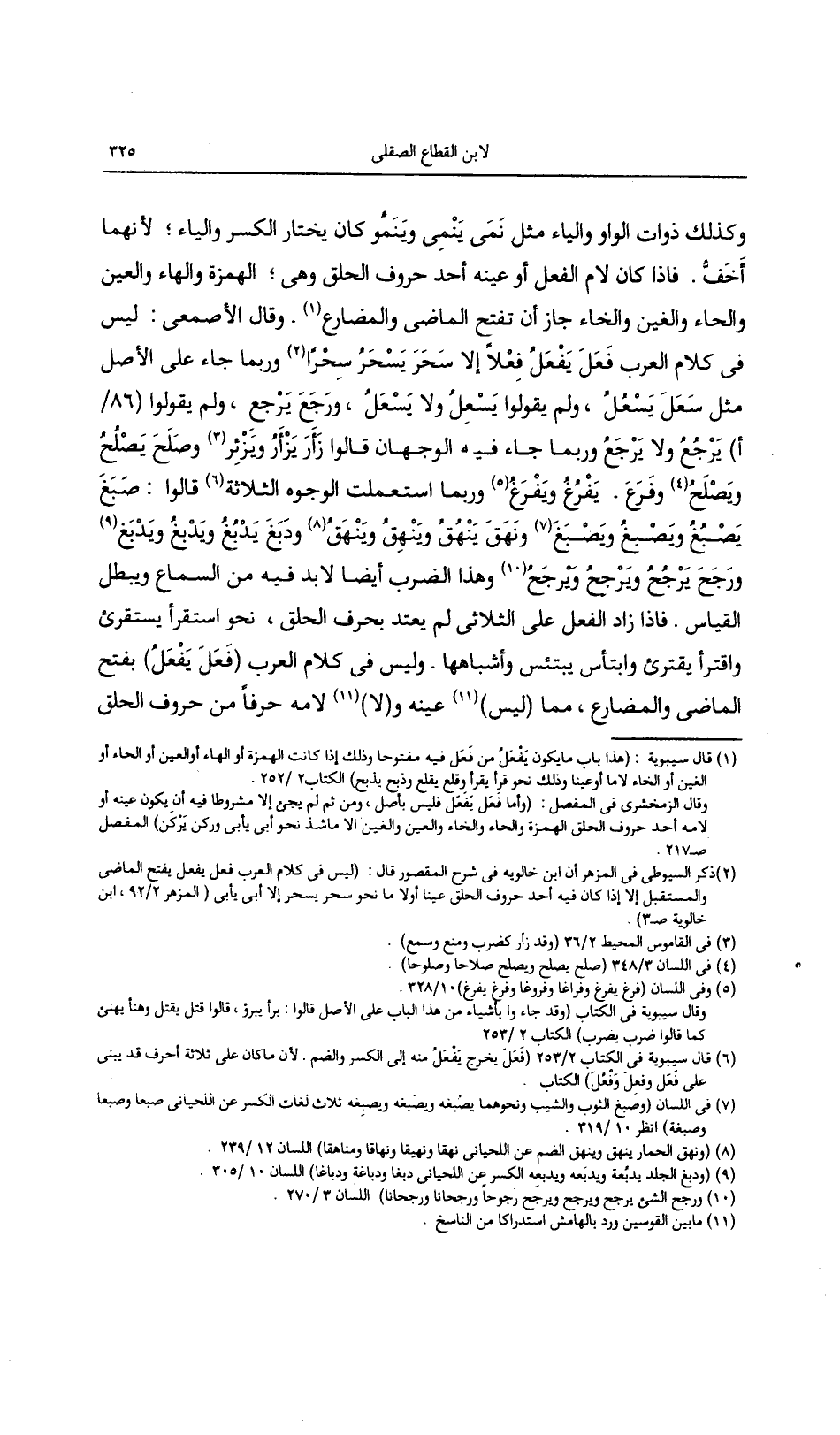 وكذلك ذوات الواو والياء مثل نمى ينمى وينمو كان يختار الكسر والياء؛ لأنهما أخف. فإذا كان لام الفعل أو عينه أحد حروف الحلق وهي؛ الهمزة والهاء والعين والحاء والغين والخاء جاز أن يفتح الماضي والمضارع. وقال الأصمعي: ليس في كلام العرب فَعَل يفعَل فعلاً إلا سحر يسحر سحراً وربما جاء على الأصل مثل سعل يسعل، ولم يقولوا يسعل ولا يسعل، ورجع يرجع، ولم يقولوا يرجع ولا يرجع وربما جاء فيه الوجان قالوا زأر يزأر ويزئر وصلح يصلح ويصلح وفرع. يفرغ يفرغ وربما استعملت الوجوه الثلاثة قالوا: صَبَغَ يَصْبُغُ ويَصْبَغُ ونَهَقَ يَنْهُقُ ويَنْهِقُ ويَنْهَقُ ودَبَغَ يَدْبُغُ ويَدْبغُ ويَدْبغُ ورَجَحَ يَرْجُحُ ويَرْجِحُ وَيرجَح وهذا الضرب أيضاً لابد فيه من السماع ويبطل القياس. فإذا زاد الفعل على الثلاثي لم يعتد بحروف الحلق، نحو استقرأ يستقرئ واقترأ يقترئ وابتأس يبتئس وأشباهها. وليس في كلام العرب (فعَل يفعَل) بفتح الماضي والمضارع، مما (ليس) عينه و (لا) لامه حرفاً من حروف الحلق