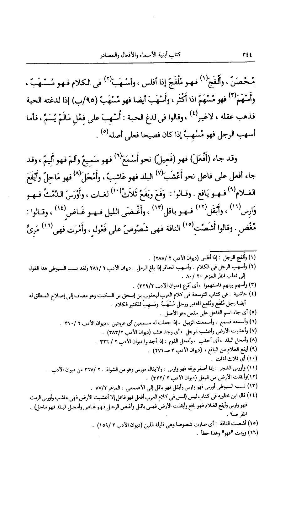 وقد جاء (أفعل) فهو (فعيلٌ) نحو أسمع فهو سميعٌ وآلم فهو أليمٌ، وقد جاء أفعل على فاعل نحو أعشب البلد فهو عاشب، وأمحل فهو ماحلٌ وأيفع الغلام فهو يافع. وقالوا: وفع ويفع ثلاث لغات، وأورس الدمث فهو وارس، وأبقل فهو باقل، وأغضى الليل فهو غاضٍ، وقالوا: مغضٍ. وقالوا أشصت الناقة فهي شصوصٌ على فعولٍ، وأمرت فهي مريُّ