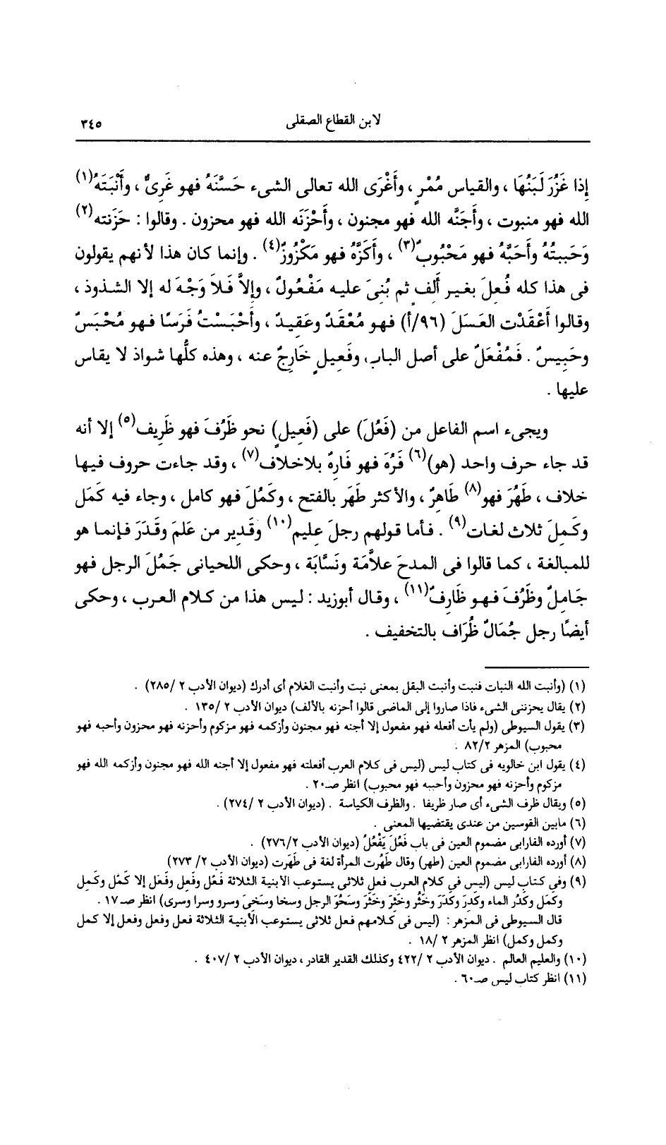 ويجيء اسم الفاعل من (فعل) على (فعيل) نحو ظرف فهو ظريف إلا أنه قد جاء حرف واحد (هو) فره فهو فارهٌ بلا خلاف، وقد جاءت حروف فيها خلاف، طهر فهو طاهرٌ، والأكير طهر بالفتح، وكمل فهو كامل، وجاء فيه كمل وكمل ثلاث لغات. فأما قولهم رجل عليم وقدير من علم وقدر فإنما هو للمبالغة، كما قالوا في المدح علامة ونسَّابة، وحكى اللحياني جمل الرجل فهو جاملق وظرف فهو ظارفٌ، وقال أبو زيد: ليس هذا من كلام العرب، وحكى أيضاً رجل جمالٌ طراف بالتخفيف.