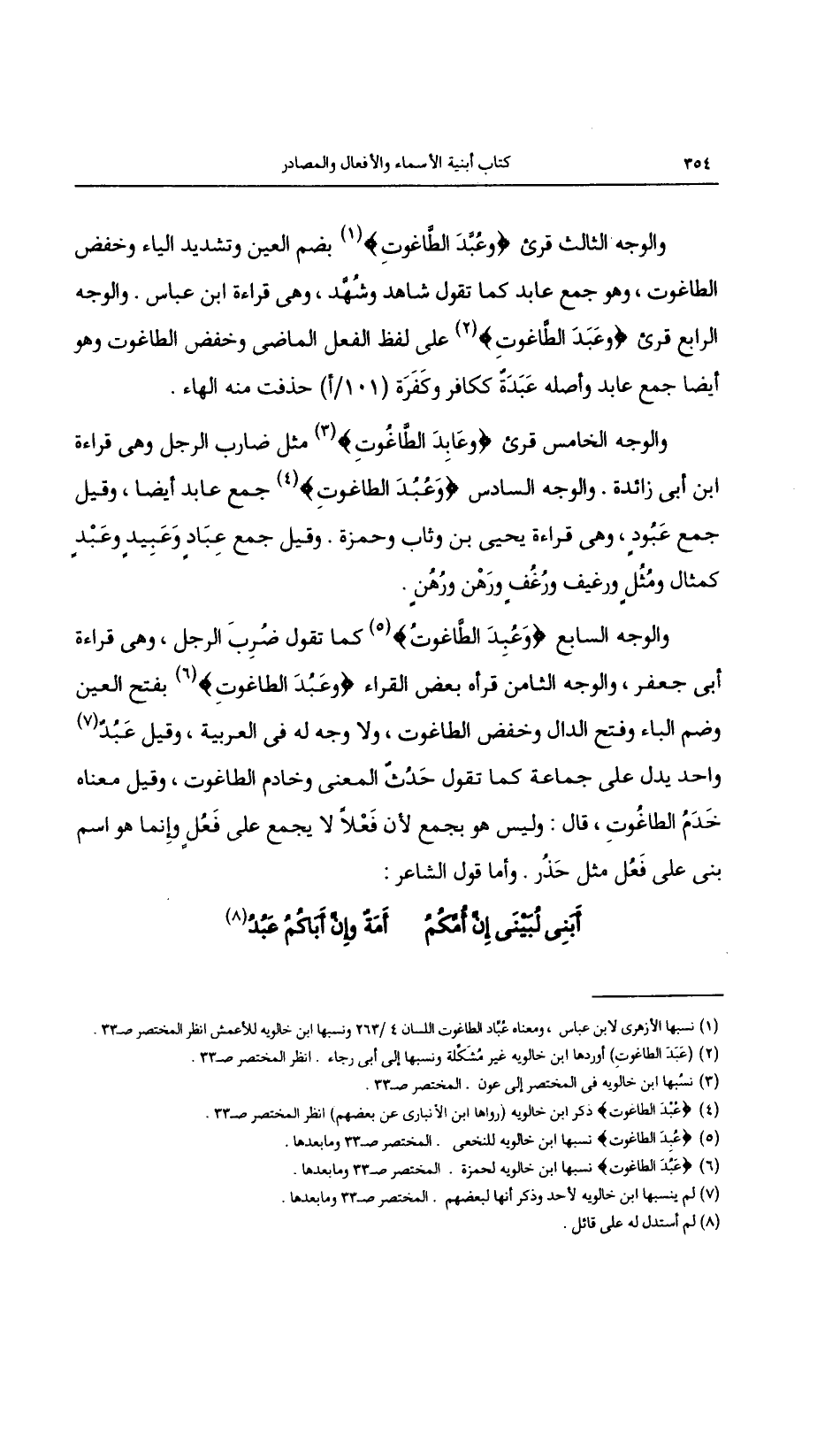 والوجه السابع {وعُبِدَ الطاغوت} كما تقول ضُرِب الرجل، وهي قراءة أبي جعفر، والوجه الثامن قرأه بعض القراء {وعَبُدَ الطاغوت} بفتح العين وضم الباء وفتح الدال وخفض الطاغوت، ولا وجه له في العربية، وقيل عَبُدً واحد يدل على جامعة كما تقول حَدُثٌ المعنى وخادم الطاغوت، وقيل معناه خدم الطاغوت، قال: وليس هو بجمع لأن فعلاً لا يجمع على فعلٍ وإنما هو اسم بني على فعل مثل حَذُر. وأما قول الشاعر: