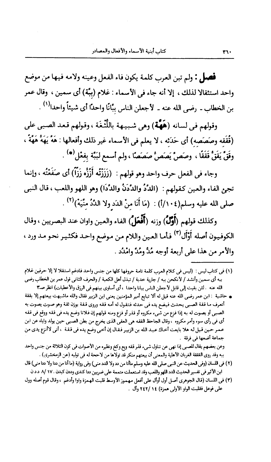 فصل: ولم تبن العرب كلمة يكون فاء الفعل وعينه ولامه فيها من موضع واحد استثقالاً لذلك، إلا أنه جاء في الأسماء: غلام (ببة) أي سمين، وقال عمر بن الخطاب - رضي الله عنه - لأجعلن الناس بباناً واحداً أي شيئاً واحداً.