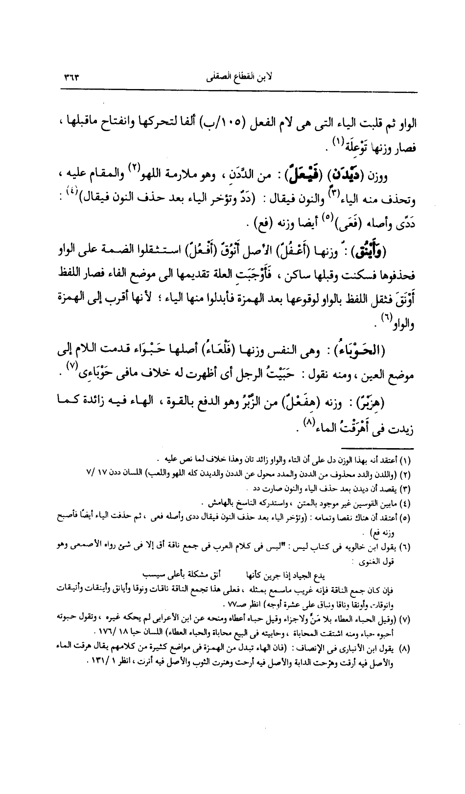 ووزن (ديدنٍ) (فيعل): من الددن، وهو ملازمة اللهو والمقام عليه، وتحذف منه الياء والنون فيقال: (ددٌ وتؤخر الياء بعد حذف النون فيقال): ددىً وأصله (فعى) أيضاً وزنه (فع).