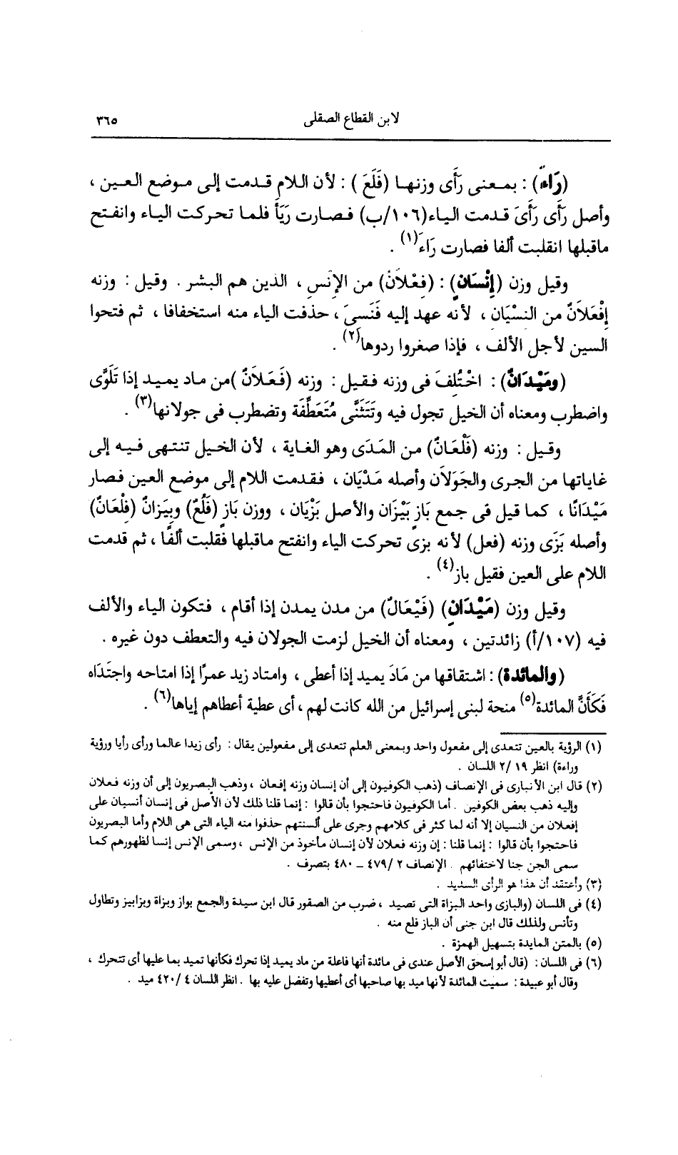وقيل: وزنه (فعلانٌ) من المدى وهو الغاية، لأن الخيل تنتهي فيه إلى غاياتها من الجري والجولان وأصله مديان، فقدمت اللام إلى موضع العين فصار ميداناً، كما قيل في جمع بازٍ بيزان والأصل بزيان، ووزن بازٍ (فلعً) وبيرزانٌ (فلعانٌ) وأصله بزى وزنه (فعل) لأنه بزى تحركت الياء وانفتح ما قبلها قلبت ألفاً، ثم قدمت اللام على العين فقيل باز.