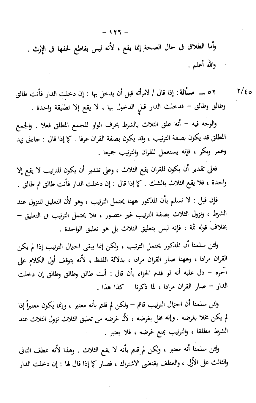 ولئن سلمنا أن احتمال الترتيب قائم- ولكن لم قلتم بأنه معتبر، وإنما يكون معتبرًا إذا لم يكن مخلًا بغرضه، وإنه مخل بغرضه، لأن غرضه من تعليق الثلاث نزول الثلاث عند الشرط مطلقًا، والترتيب يمنع غرضه، فلا يعتبر.