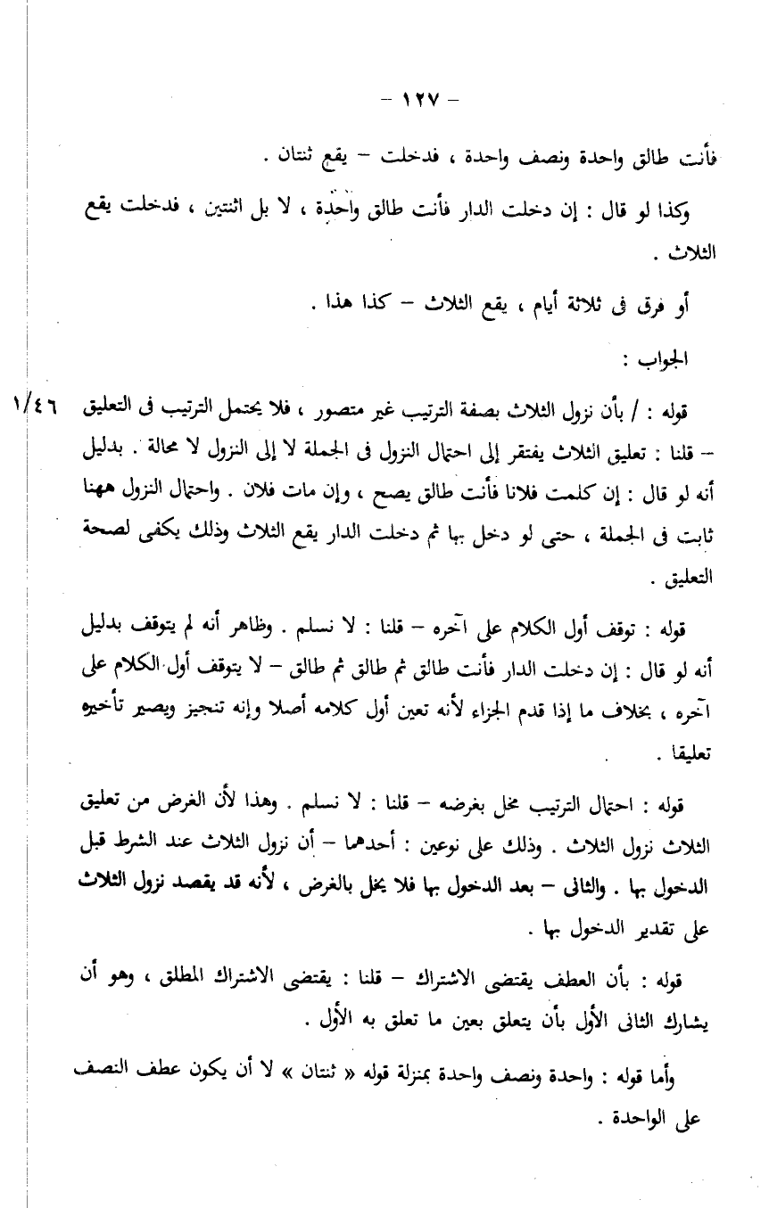 قوله: / بأن نزول الثلاث بصفة الترتيب غير متصور، فلا يحتمل الترتيب في التعيق- قلنا: تعليق الثلاث يفتقر إلى احتمال النزول في الجملة لا إلى النزول لا محالة. بدليل أنه لو قال: إن كلمت فلانًا فأنت طالق يصح، وإن مات فلان. واحتمال النزول ههنا ثابت في الجملة، حتى لو دخل بها ثم دخلت الدار يقع الثلاث وذلك يكفي لصحة التعليق.