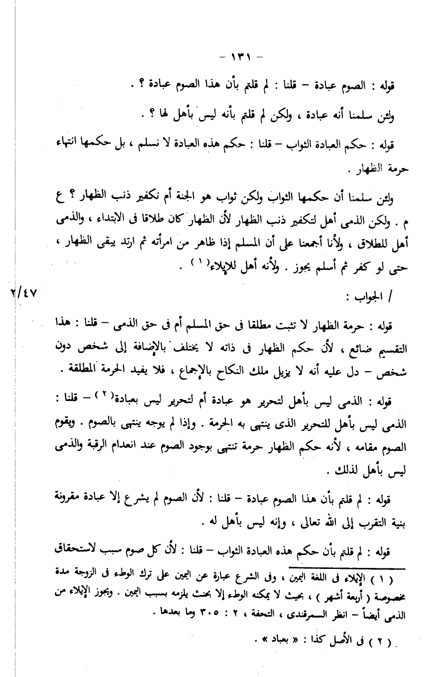 ولئن سلمنا أن حكمها الثواب ولكن ثواب هو الجنة أم تكفير ذنب الظهار؟ ع م. ولكن الذمى أهل لتكفير ذنب الظهار لأن الظهار كان طلاقًا في الابتداء، والذمى أهل للطلاق، ولأنا أجمعنا على أن المسلم إذا ظاهر من امرأته ثم ارتد يبقى الظهار، حتى لو كفر ثم أسلم يجوز. ولأنه أهل للإيلاء.