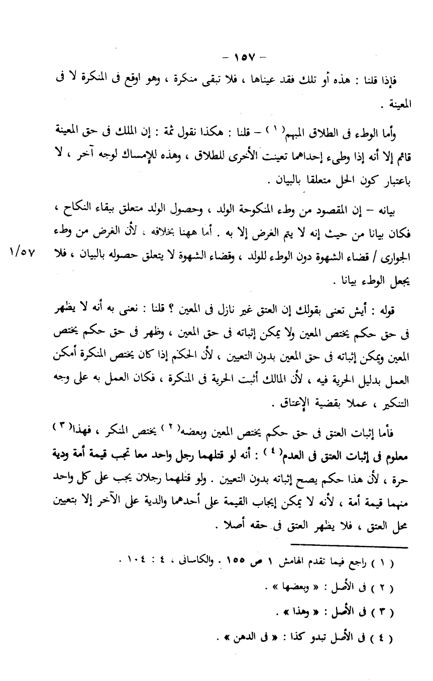 فأما إثبات العتق في حق حكم يختص المعين وبعضه يختص المنكر، فهذا معلوم في إثبات العتق في العدم: أنه لو قتلهما رجل واحد معًا تجب قيمة أمة ودية حرة، لأن هذا حكم يصح إثباته بدون التعيين. ولو قتلهما رجلان يجب على كل واحد منهما قيمة أمة، لأنه لا يمكن إيجاب القيمة على أحدهما والدية على الآخر إلا بتعيين محل العتق، فلا يظهر العتق في حقه أصلًا.