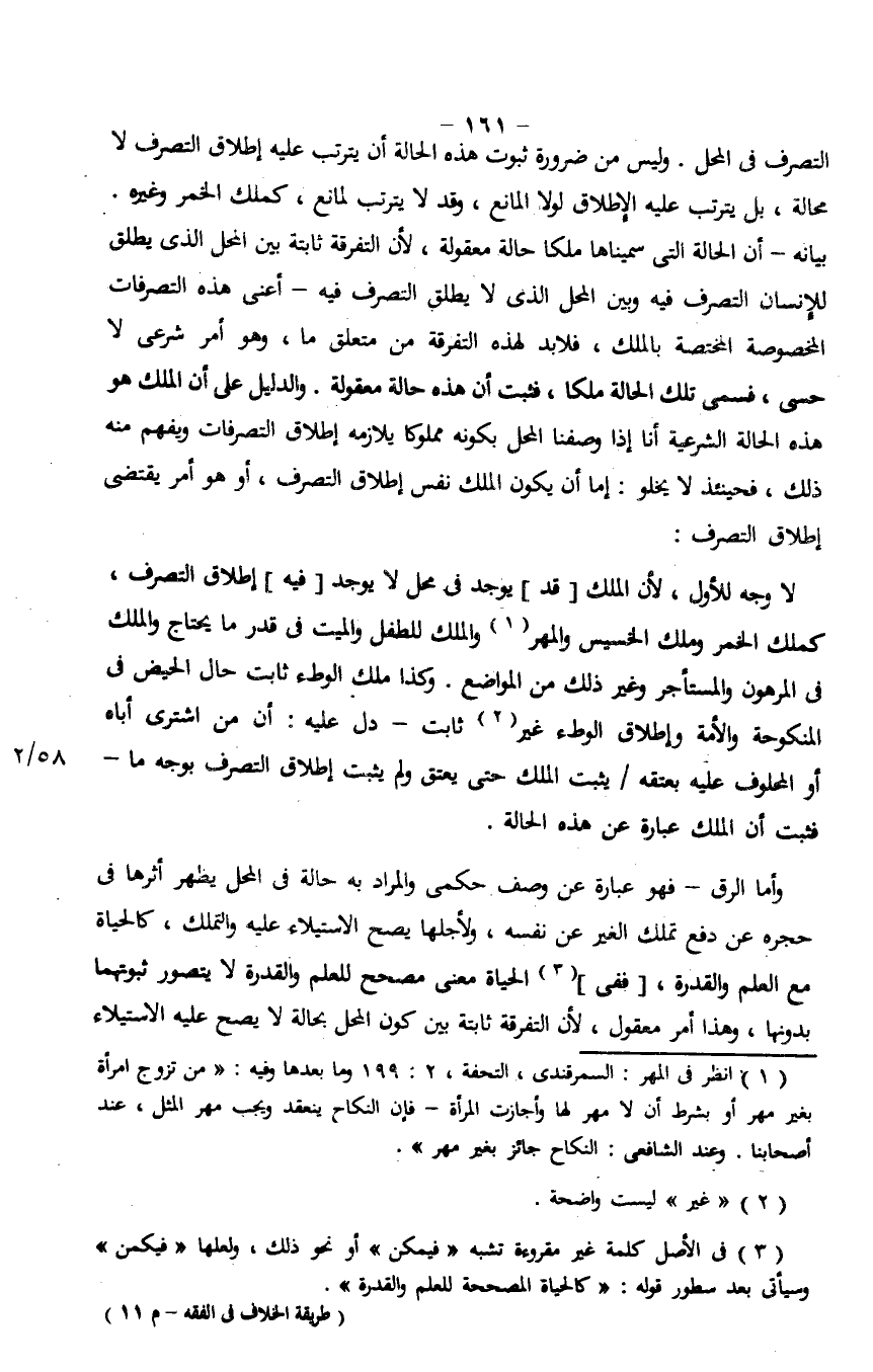 التصرف في المحل. وليس من ضرورة ثبوت هذه الحالة أن يترتب عليه إطلاق التصرف لا محالة، بل يترتب عليه افطلاق لولا المانع، وقد لا يترتب لمانع، كملك الخمر وغيره بيانه- أن الحالة التي سميناها ملكًا حالة معقولة، لأن التفرقة ثابتة بين المحل الذي يطلق للإنسان التصرف فيه وبين المحل الذي لا يطلق التصرف فيه- أعني هذه التصرفات المخصوصة المختصة بالملك، فلا بد لهذه التفرقة من متعلق ما، وهو أمر شرعي لا حسي، فسمى تلك الحالة ملكًا، فثبت أن هذه حالة معقولة. والدليل على أن الملك هو هذه الحالة الشرعية أنا إذا وصفنا المحل بكونه ملوكًا يلازمه إطلاق التصرفات ويفهم منه ذلك، فحينئذ لا يخلو: إما أن يكون الملك نفس إطلاق التصرف، أو هو أمر يقتضي إطلاق التصرف:
