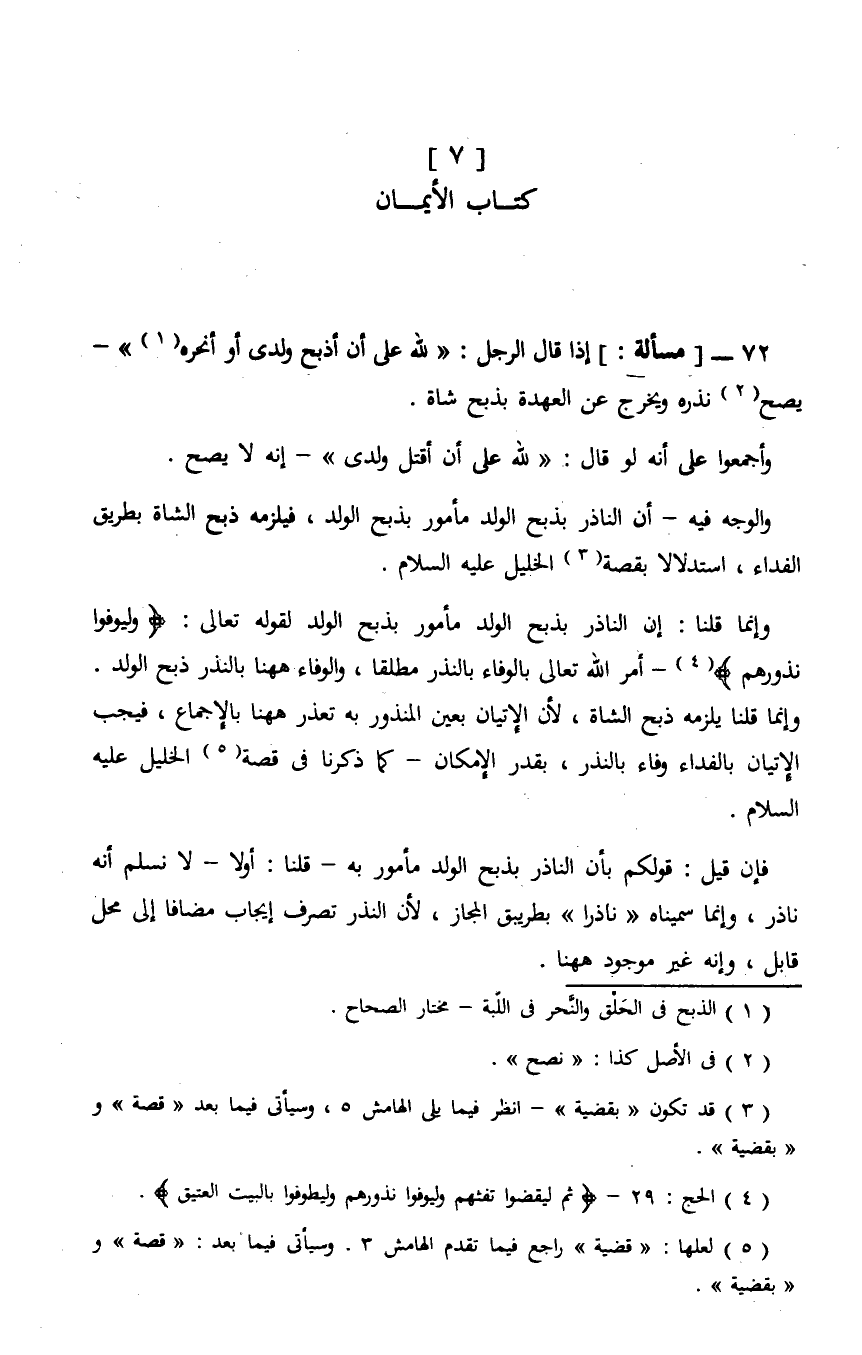 وإنما قلنا: إن الناذر بذبح الولد مأمور بذبح الولد لقوله تعالى: {وَلْيُوفُوا نُذُورَهُمْ} - أمر الله تعالى بالوفاء بالنذر مطلقًا، والوفاء ههنا بالنذر ذبح الولد. وإنما قلنا يلزمه ذبح الشاة، لأن الإتيان بعين المنذور به تعذر ههنا بالإجماع، فيجب الإتيان بالفداء وفاء بالنذر، بقدر الإمكان- كما ذكرنا في قصة الخليل عليه السلام.