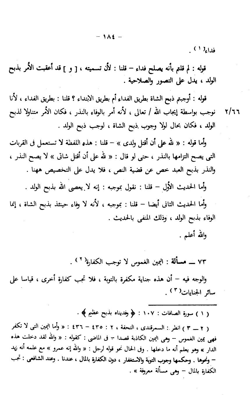 وأما قوله: "لله علي أن أقتل ولدي"- قلنا: هذه اللفظة لا تستعمل في القربات التي يصح التزامها بالنذر، حتى لو قال: "لله علي أن أقتل شاتي" لا يصح النذر، والنذر بذبح العبد خص عن قضية النص، فلا يدل على التخصيص ههنا.